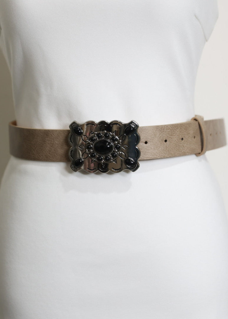 Elevate your look with the Savanna Buckle Belt, a refined yet bold accessory that blends rustic charm with modern flair. Featuring a wide taupe faux leather band and a striking silver-tone buckle inlaid with glossy black stones, this belt adds instant sophistication to any outfit — from denim to dresses.