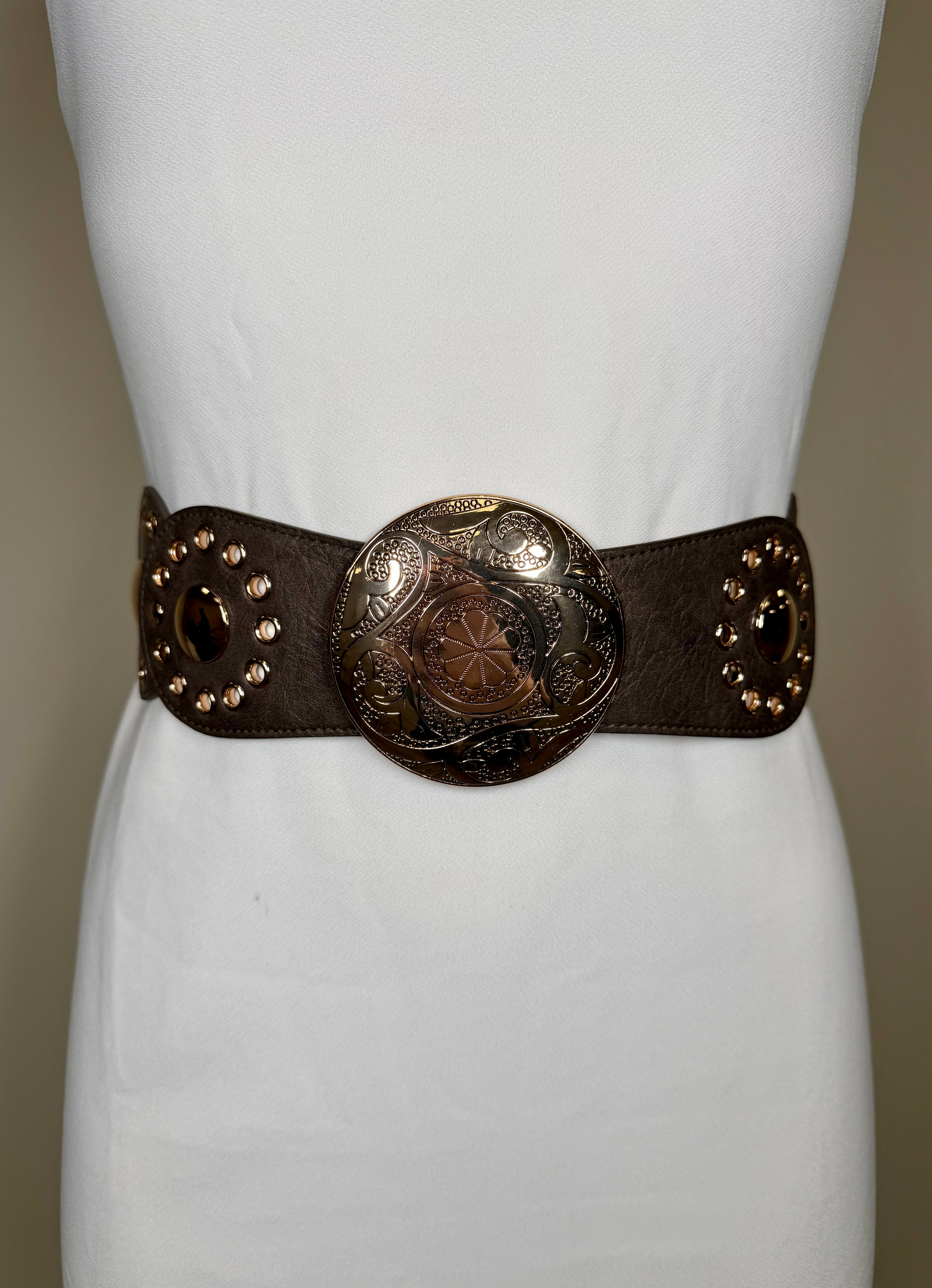 Make a bold statement with the Kelly disc belt, a unique piece made of oval leather panels with gold eyelets and shell details. Designed to cover with personality and movement, this belt combines rustic textures with an avant-garde style, perfect to attract attention at festivals, rodeos or elegant looks for everyday life.