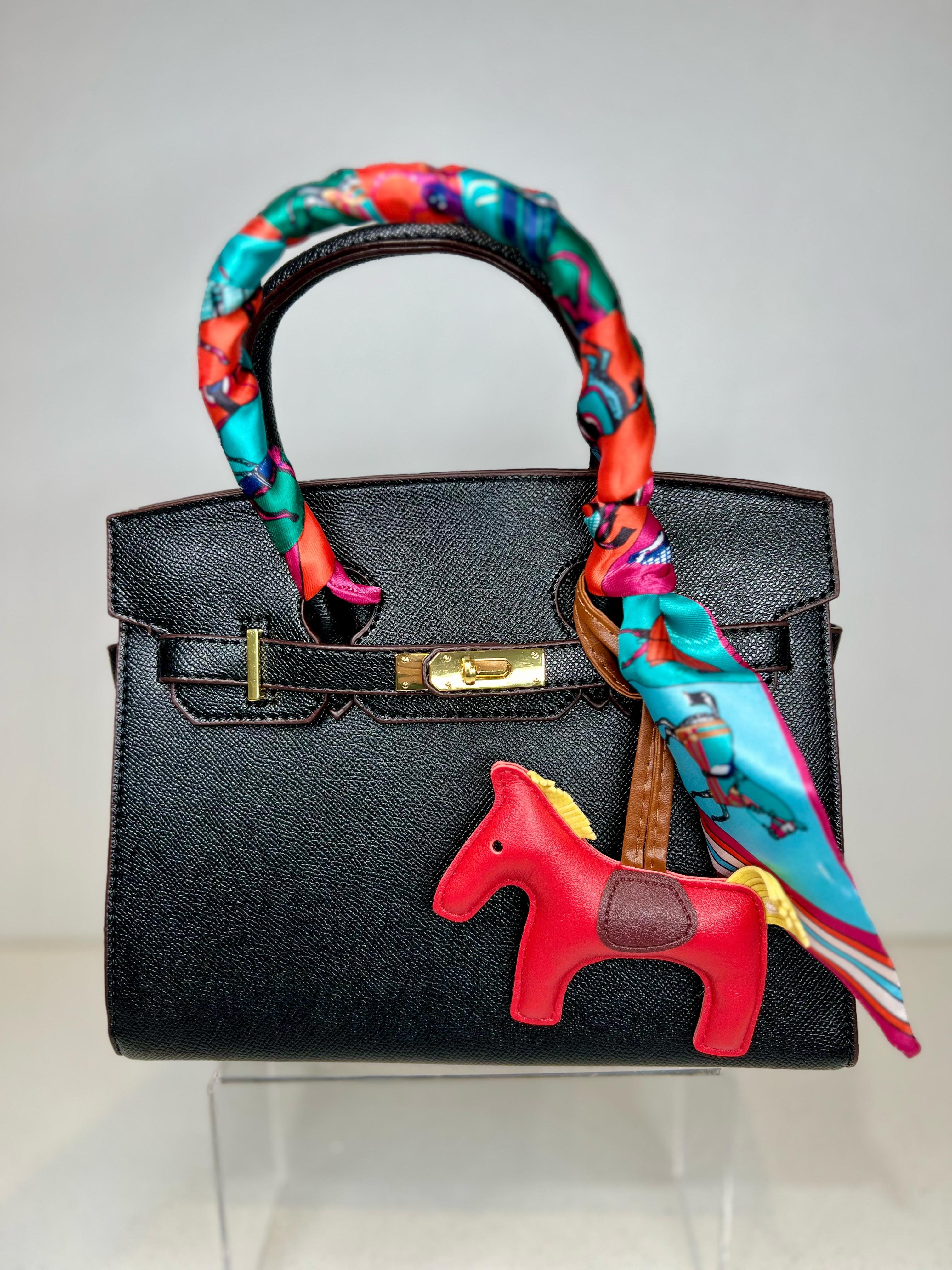 This standout orange handbag blends classic structure with playful flair. Wrapped handles in a vibrant multicolor scarf elevate its charm, while a bold red horse keychain adds a whimsical touch. The rich red tone and gold hardware give it a luxe finish.