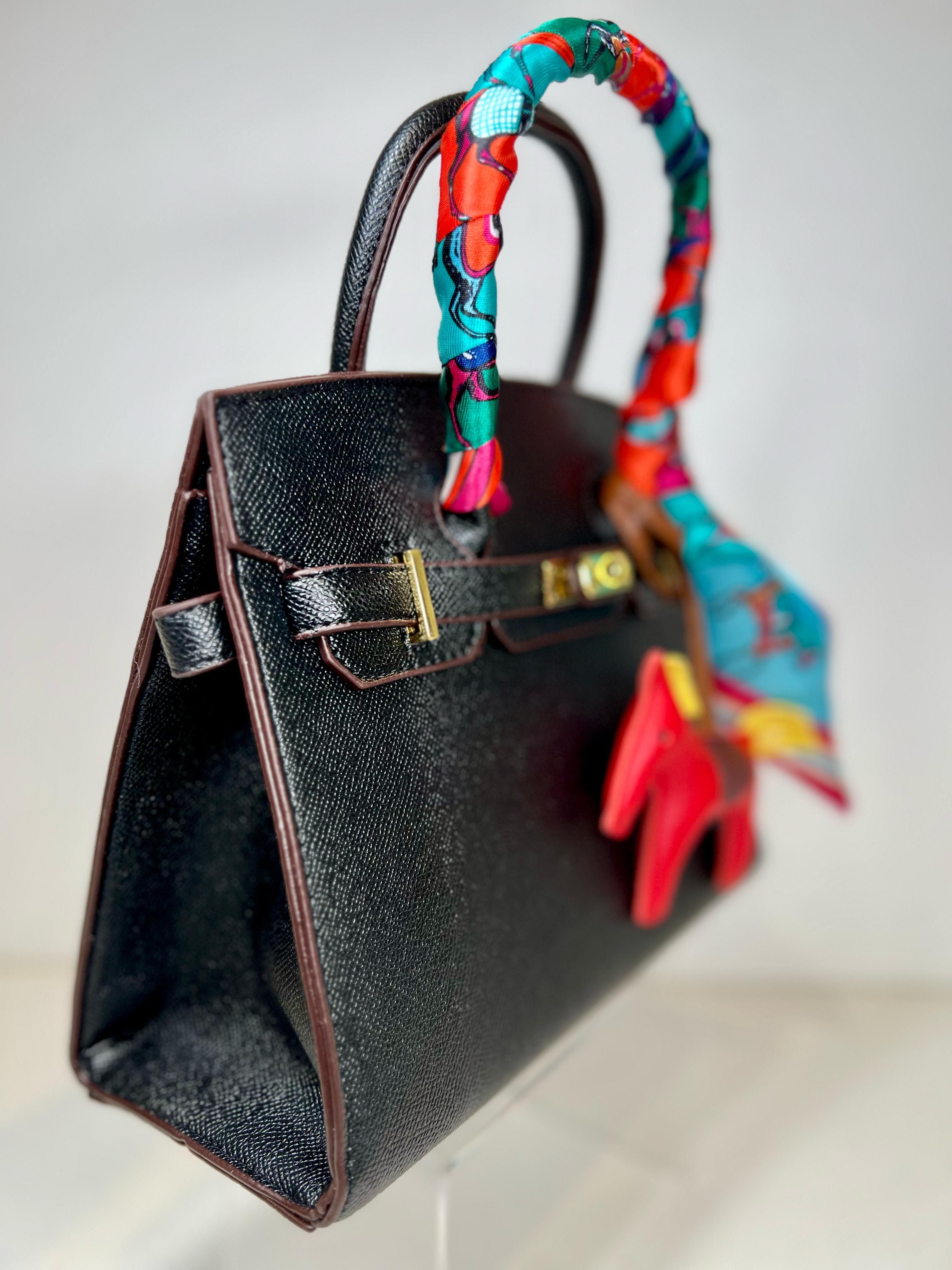 Black Structured Handbag with Scarf-Wrapped Handles and Charm Accent