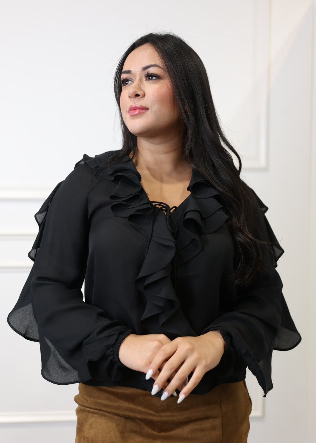 Amelie - Black Oversized Ruffle V-Neck Blouse