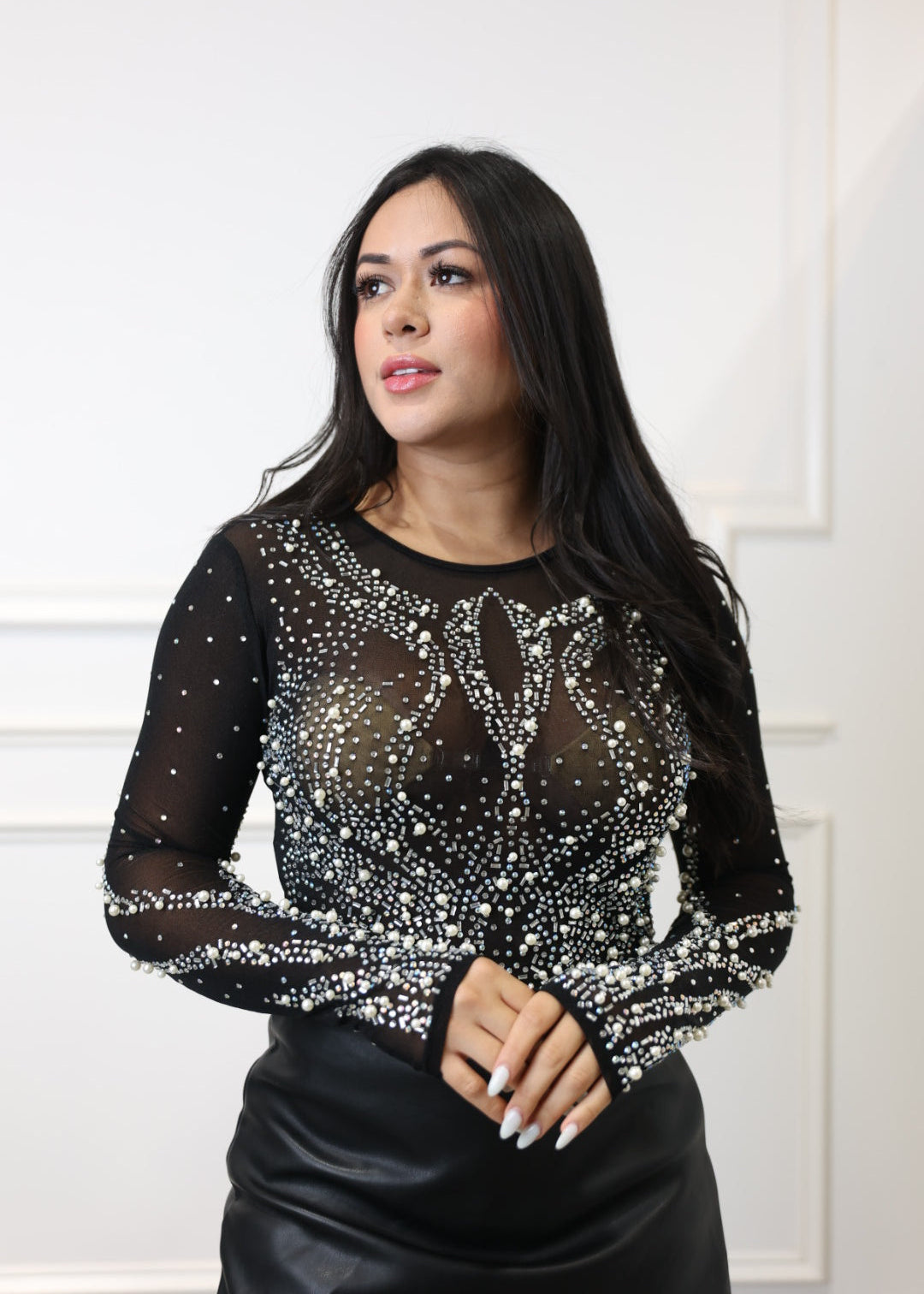Perla - Black Pearl & Diamond Embellished Mesh Top