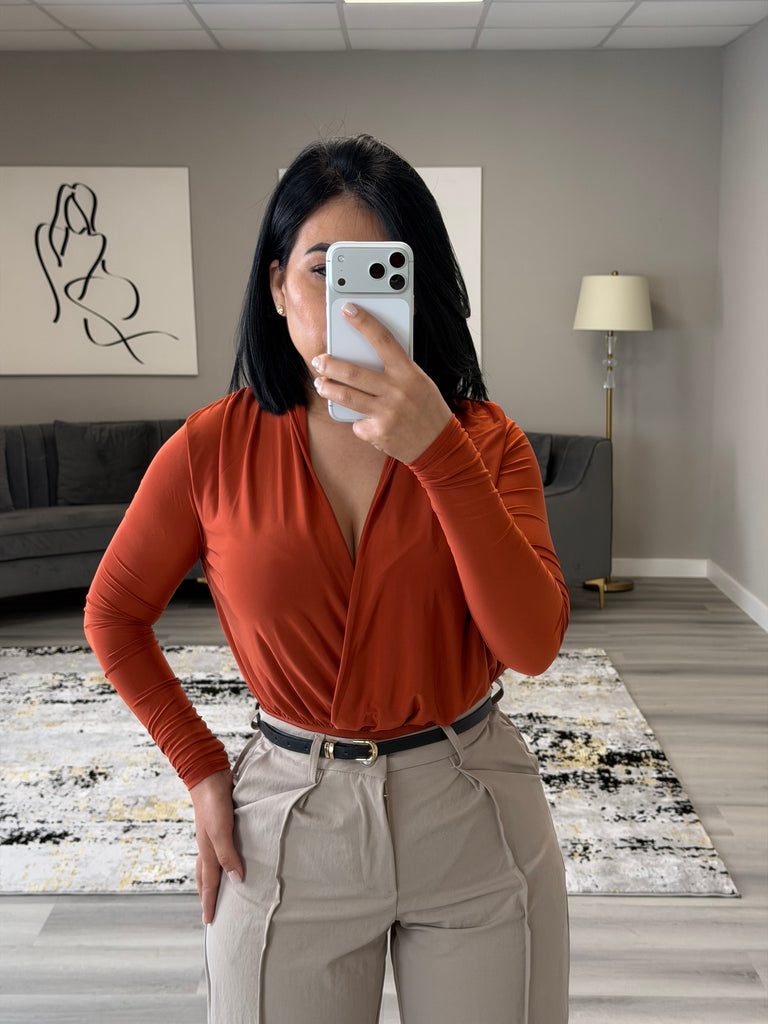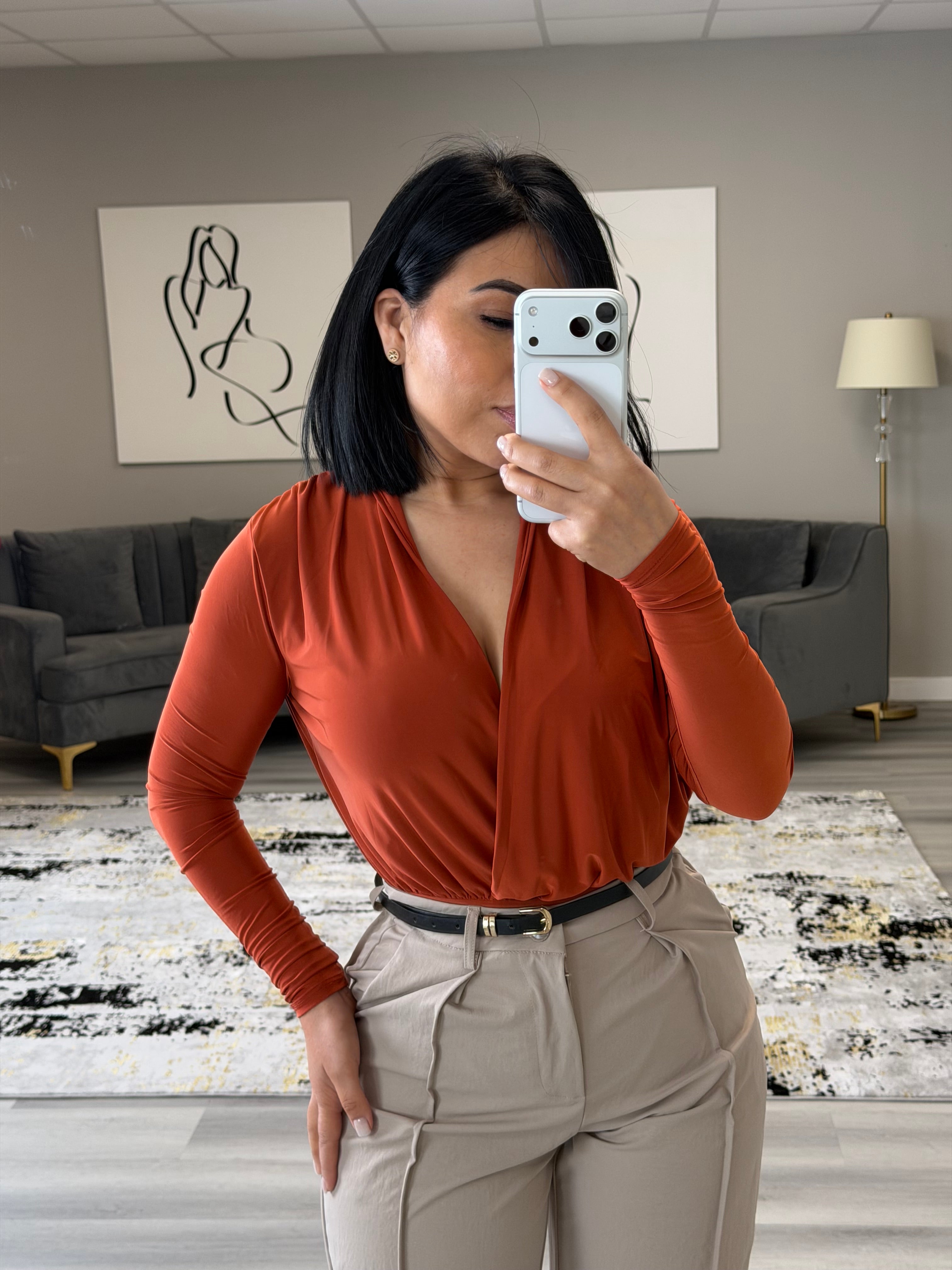 An elegant long-sleeved bodysuit with a V-neckline with draped style and a silhouette that attracts the body. Handmade in soft elastic fabric, it is a versatile essential for layers or wear only with elegant confidence.