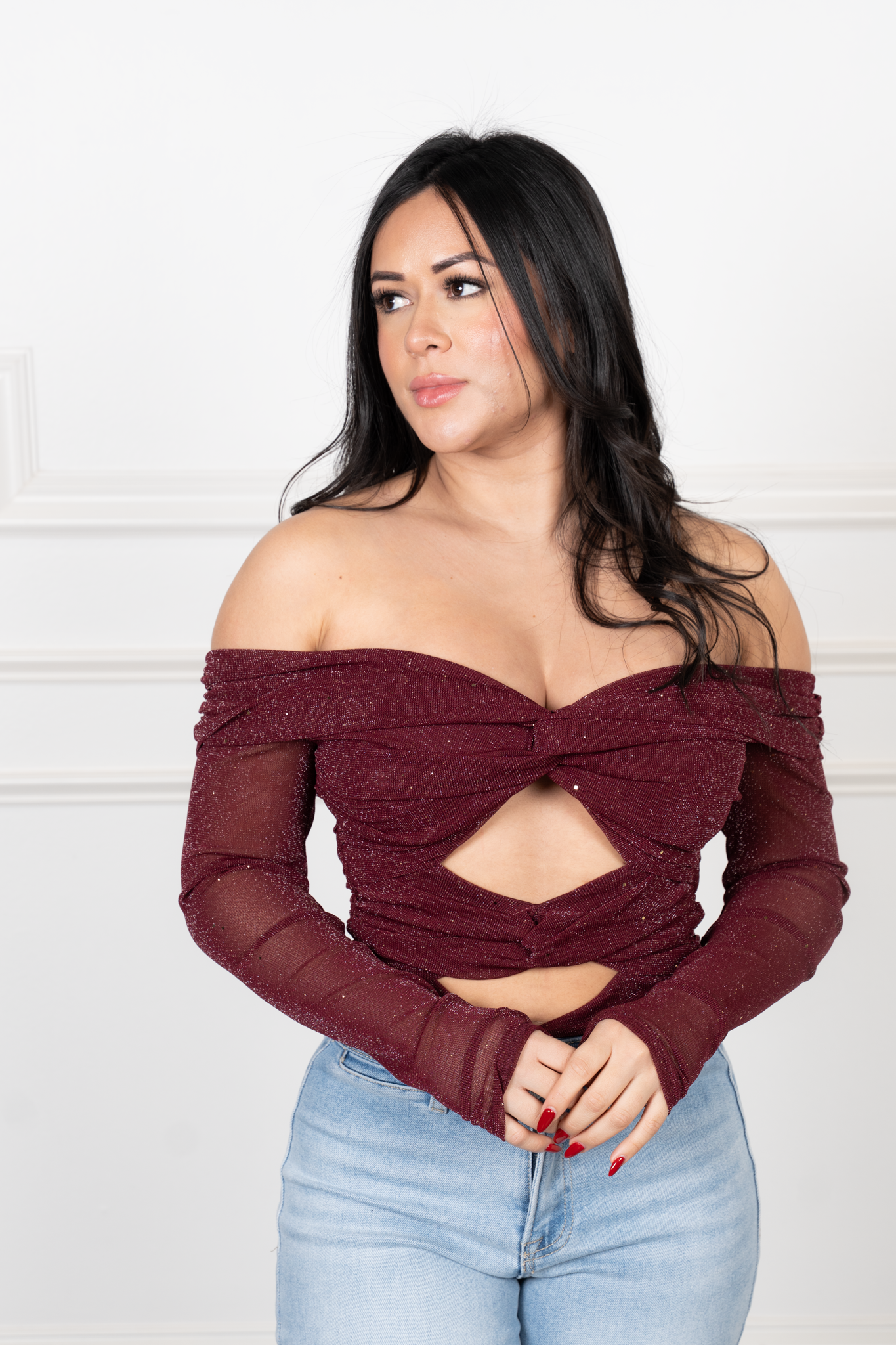 Muse-Burgandy Off Shoulder Long Sleeve Bodysuit