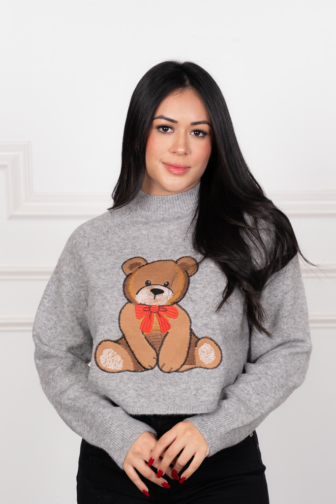 Lorena - Gray Cropped Bear Embroidered Sweater