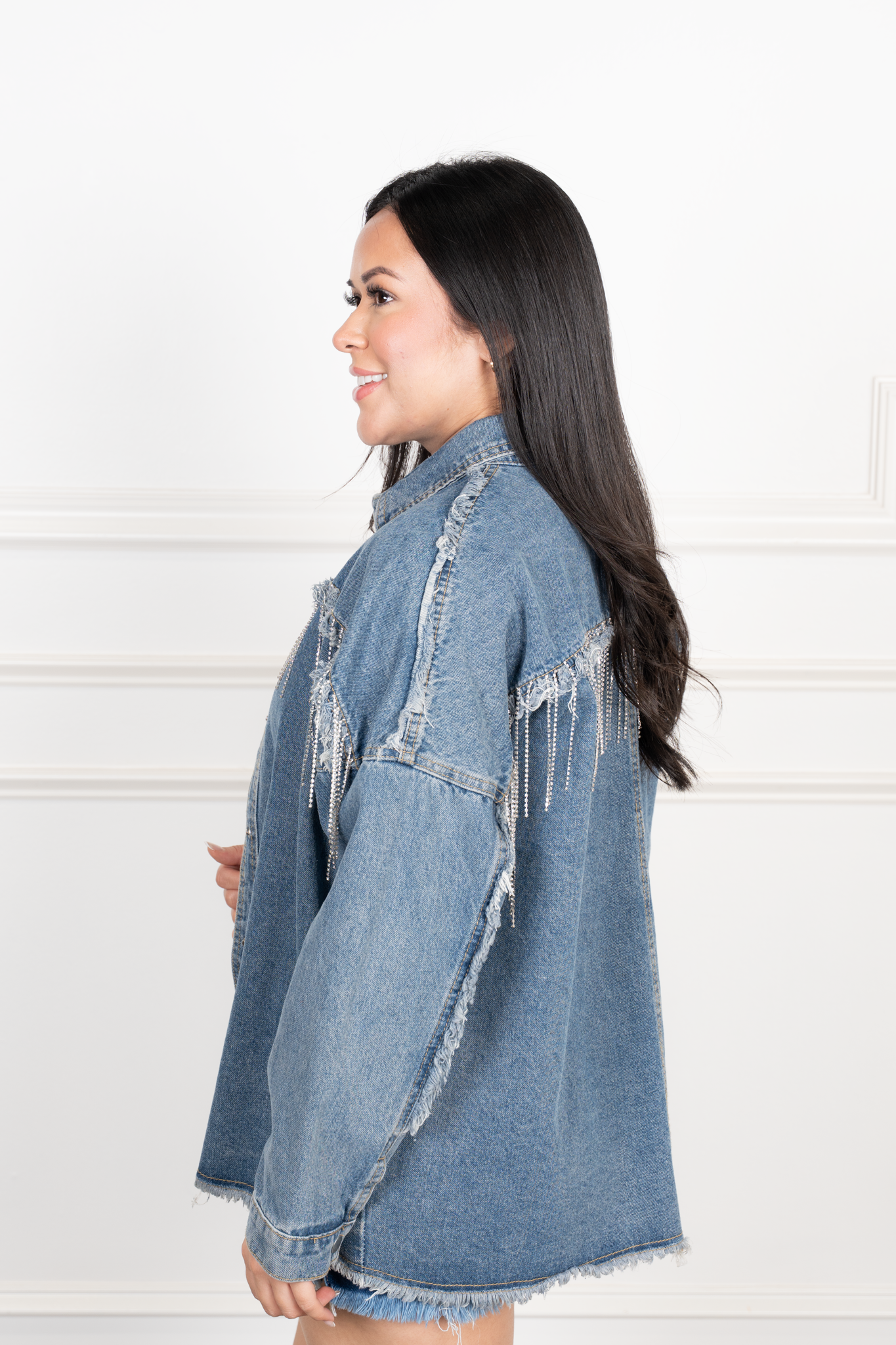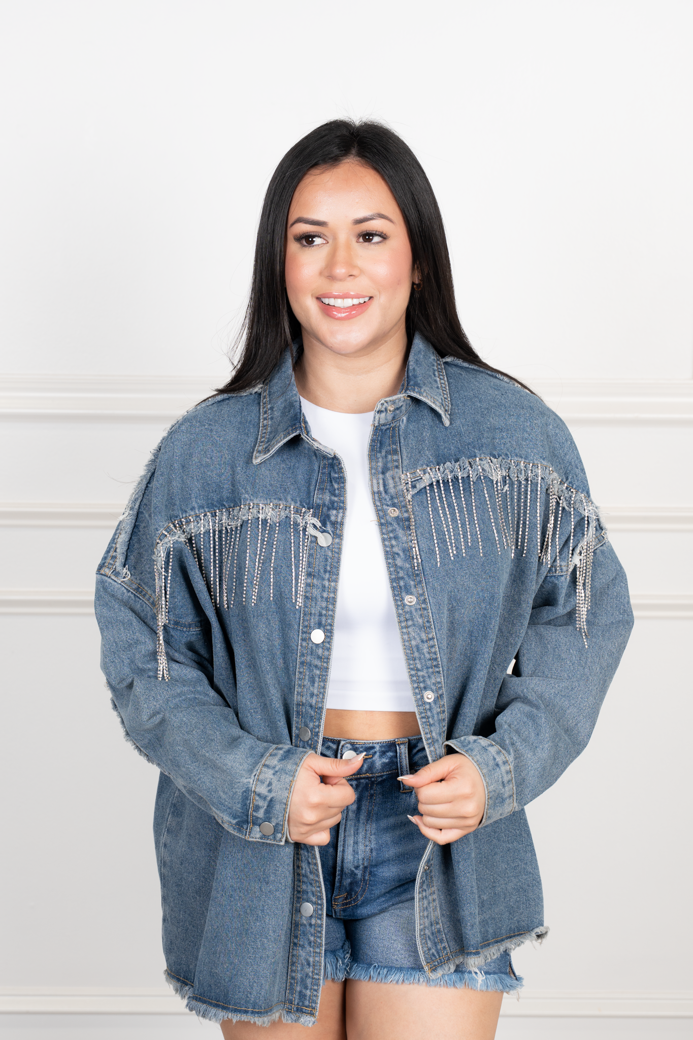 A unique denim jacket oversized decorations rhinestone on the front. Designed with a polo-style collar, front button closure it combines classic denim with a feminine, western touch.