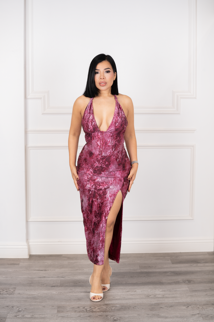 Florencia - Fuchsia Floral Mesh Halter Midi Dress