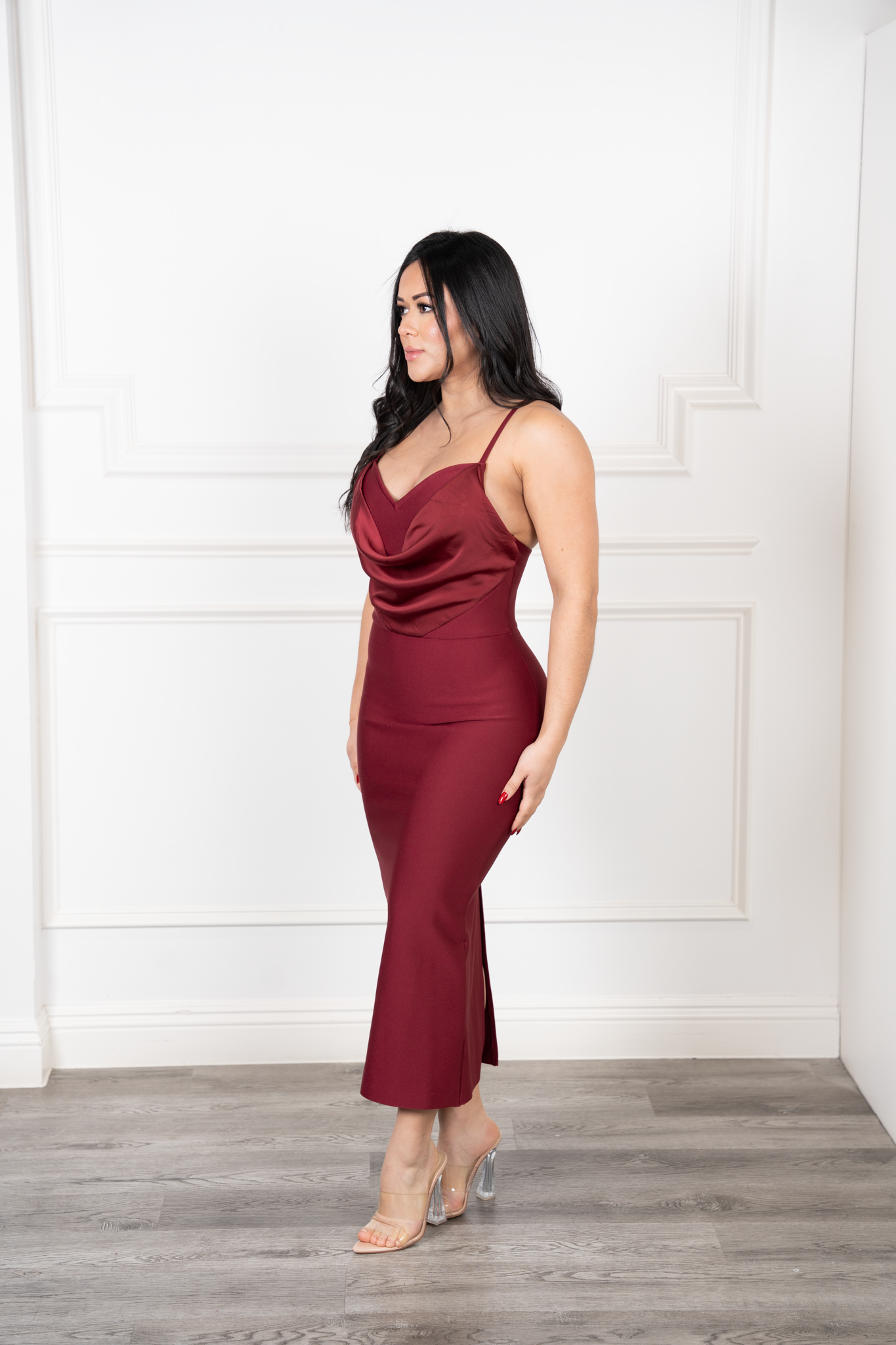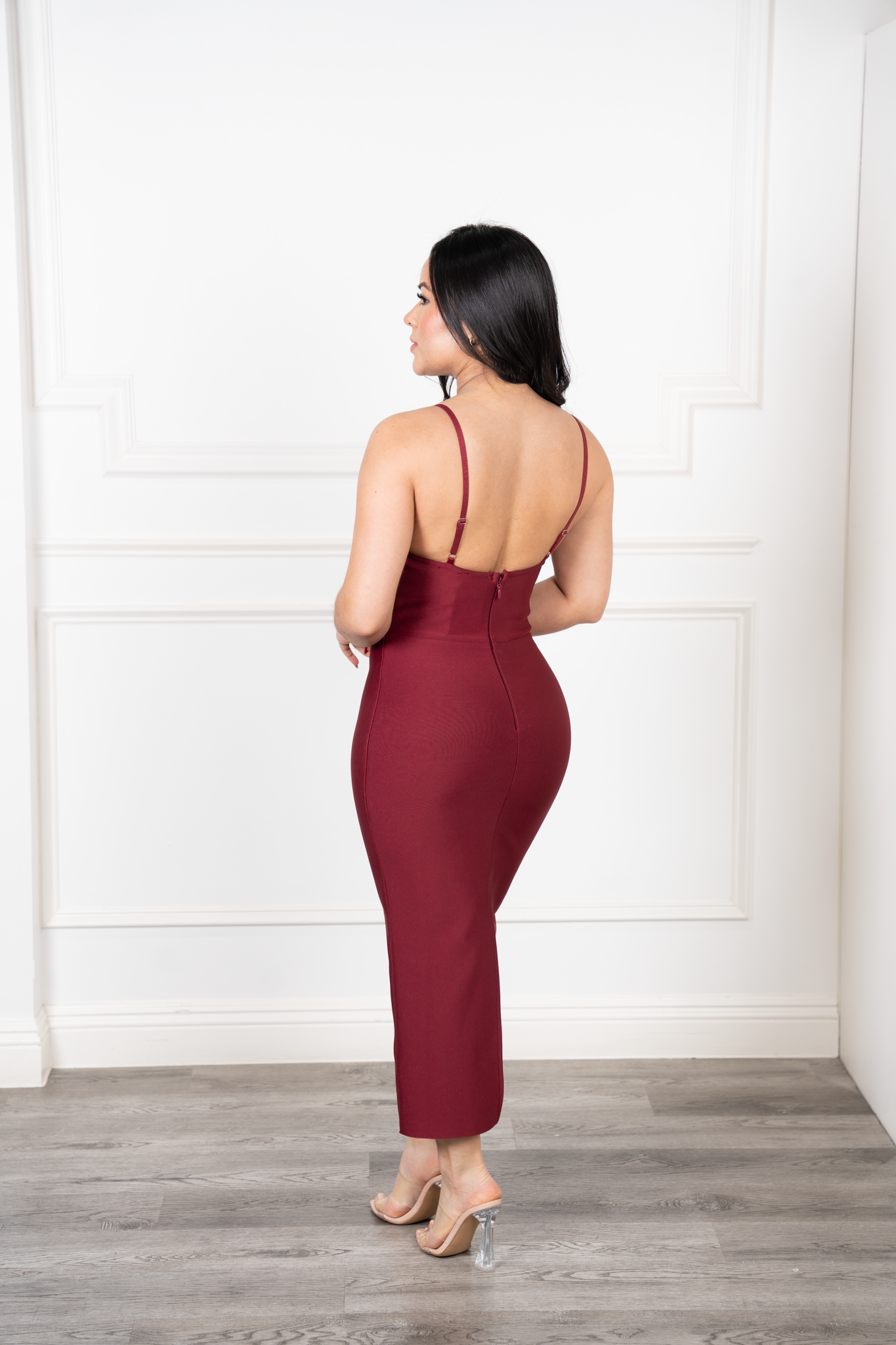 The midi dress embodies pure sophistication with a touch of glamour. Designed with straps and a semi-heart neckline, it is adorned with delicate gathered fabric. Its bandage fabric embraces the body in a pencil-cut silhouette, while the back opening ensures an elegant movement. Perfect for galas, formal events or any occasion where timeless elegance is essential.