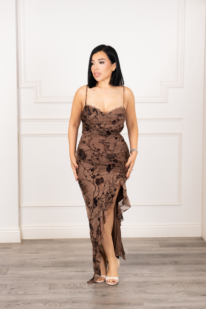 Elegant adjustable-strap midi dress featuring a heart-shaped neckline with built-in padding, side ruching for a corrugated effect, and a left-leg slit. Made from soft stretch velvet with a delicate floral print for a romantic, refined finish.