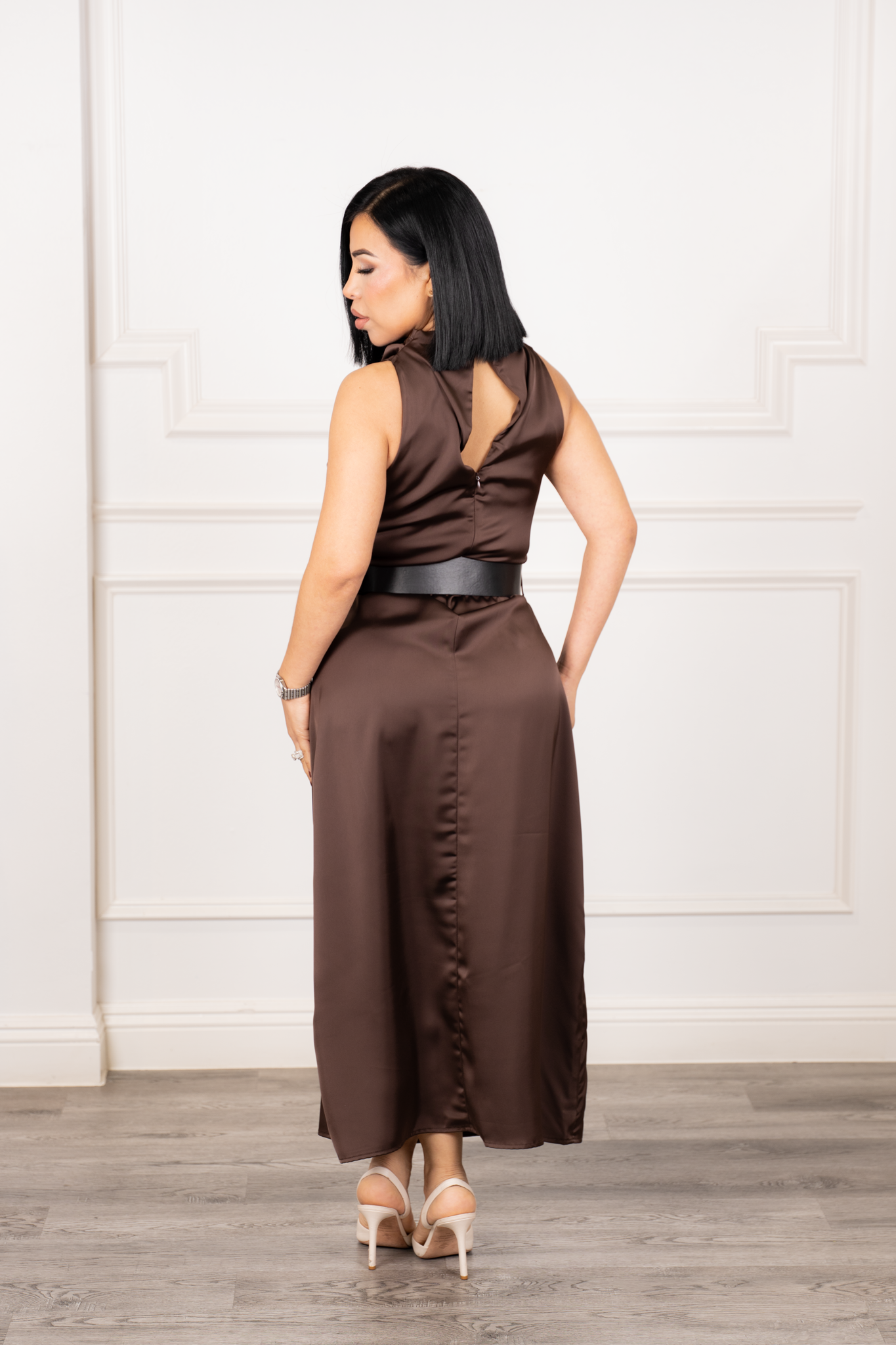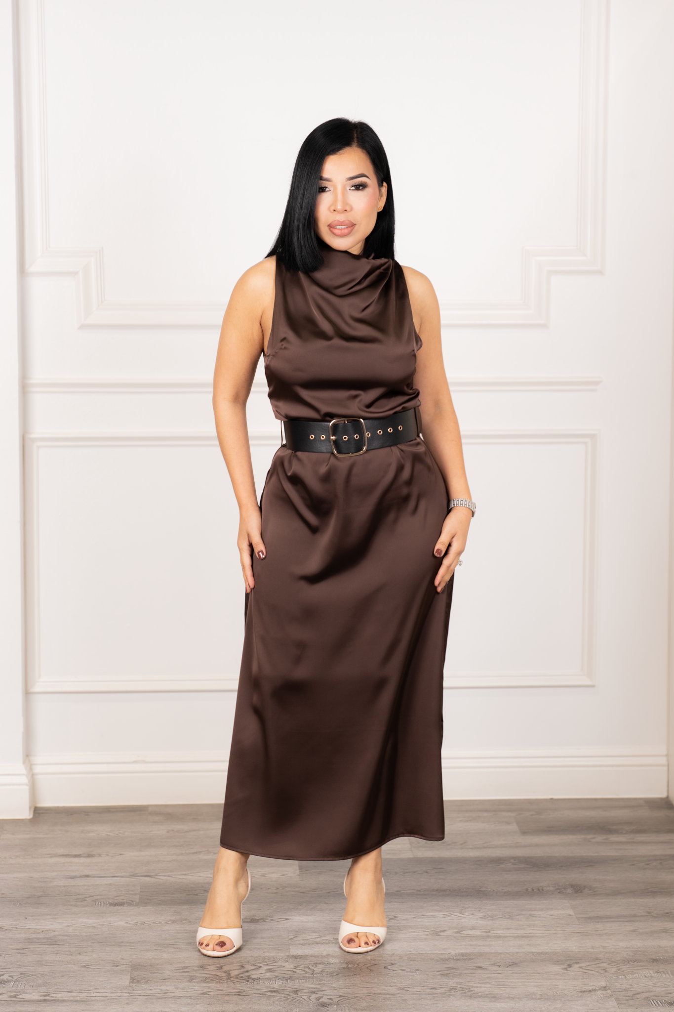 Refined sleeveless satin midi dress featuring a high draped neckline with button closure at the back and a soft side slit. Includes a wide matching belt to accentuate the waist, offering elegance with fluid movement and shine.