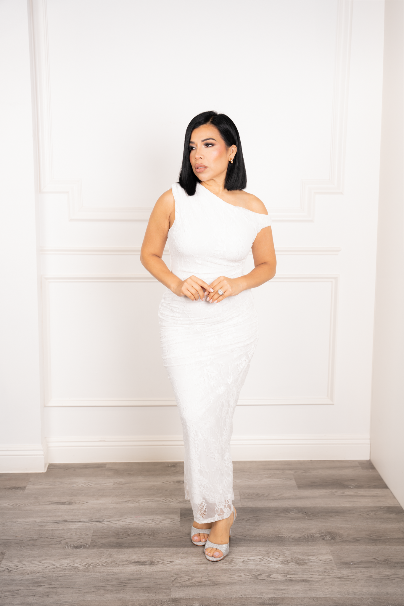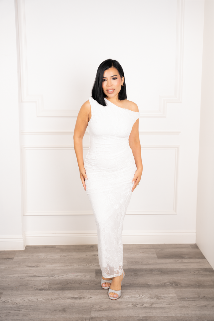 Mandy - White Asymmetrical Lace Midi Dress