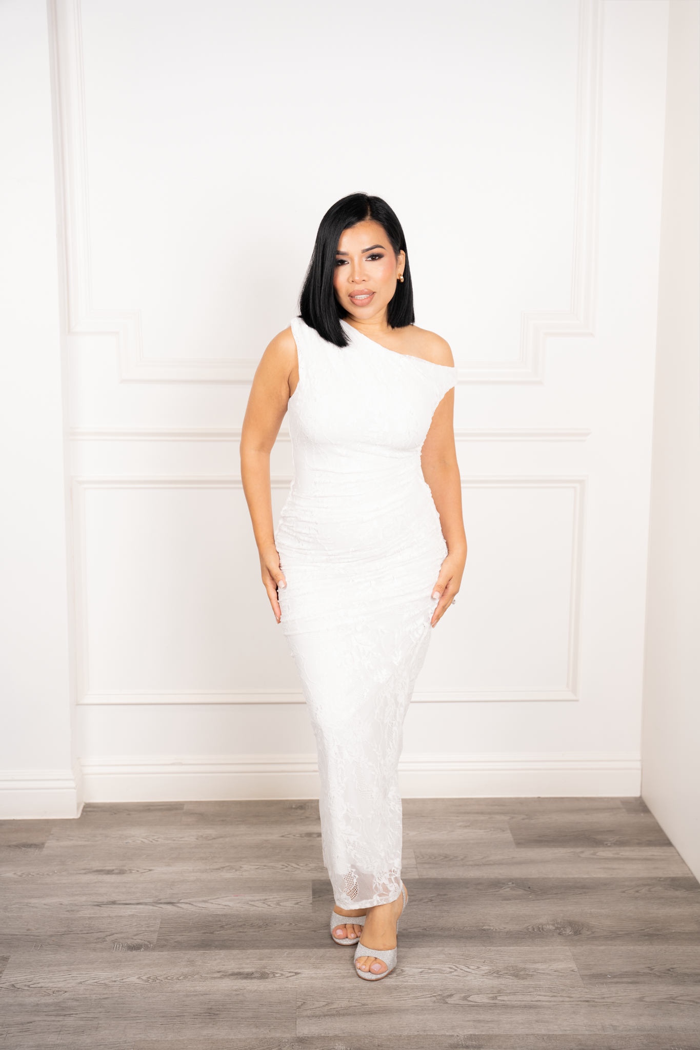 This breathtaking lace midi dress features an asymmetrical neckline with one strap gracefully draped off the shoulder, creating a soft and romantic silhouette. The side ruching enhances the figure, while the double-layered stretch fabric ensures both comfort and a flattering fit. Finished with a discreet side zipper for a seamless look.