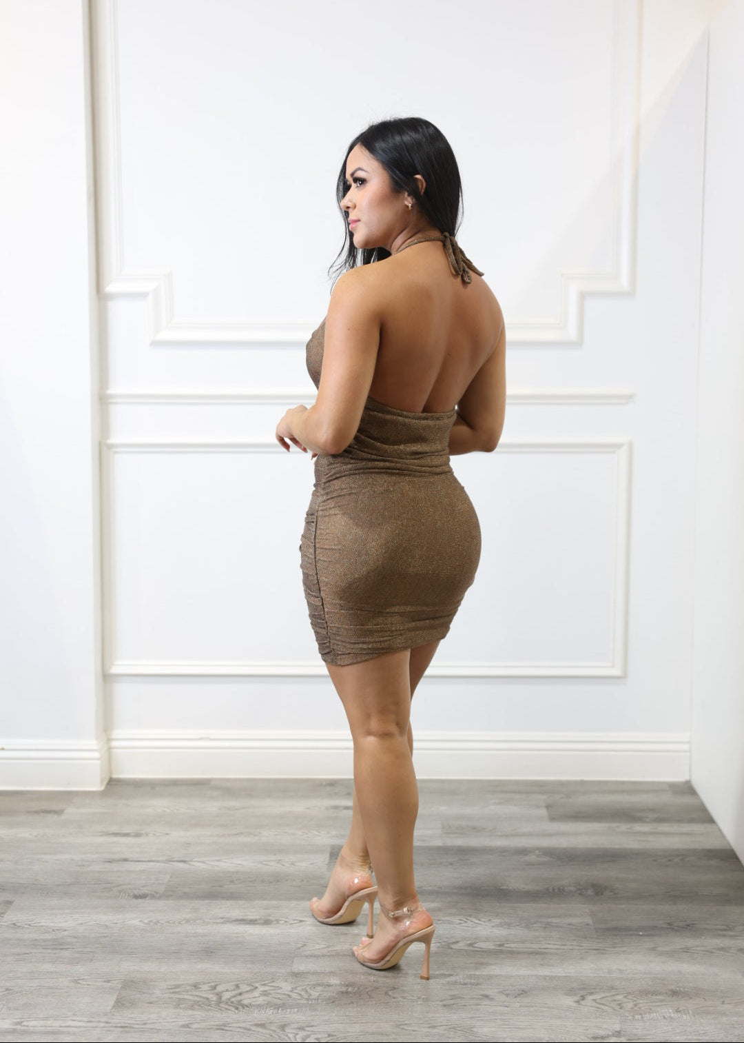 Ruched Metallic Halter Mini Dress – Glamorous & Flattering