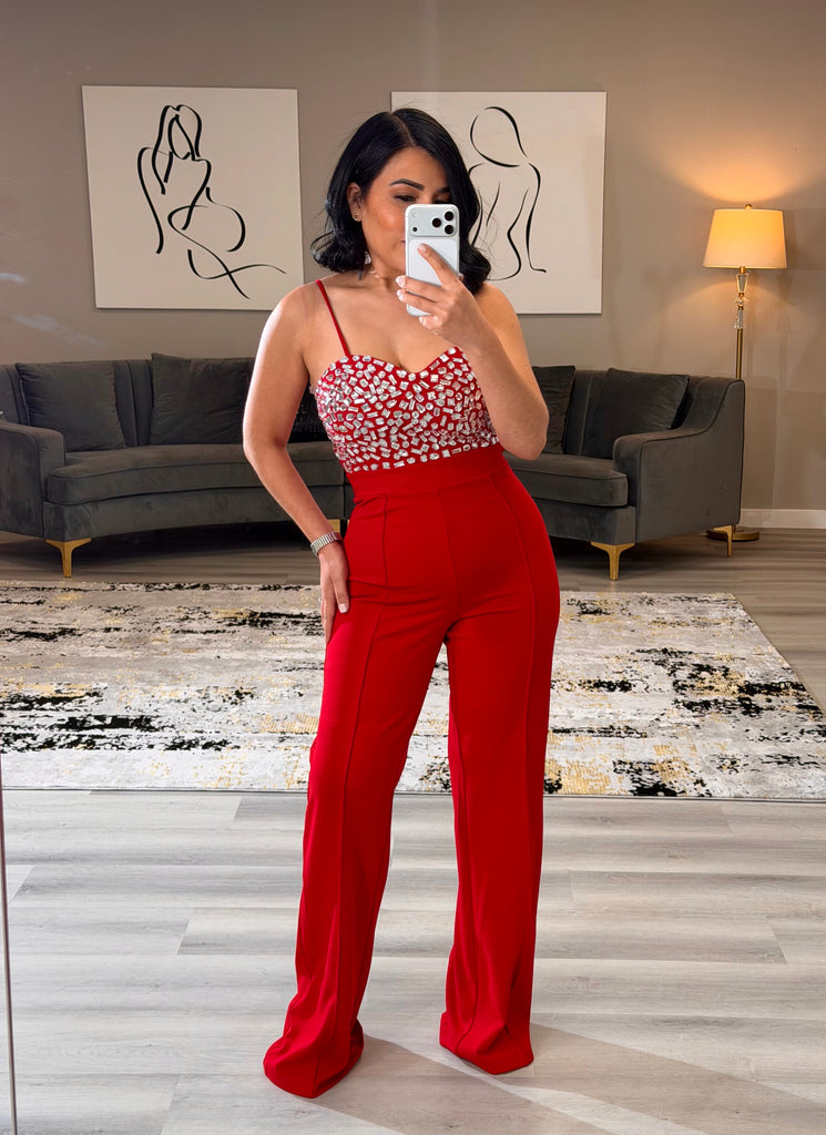 Juliana - Red Geometric Rhinestone Wide-Leg Jumpsuit