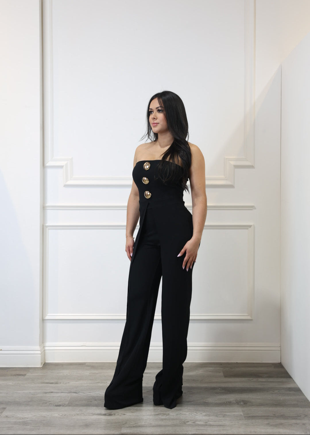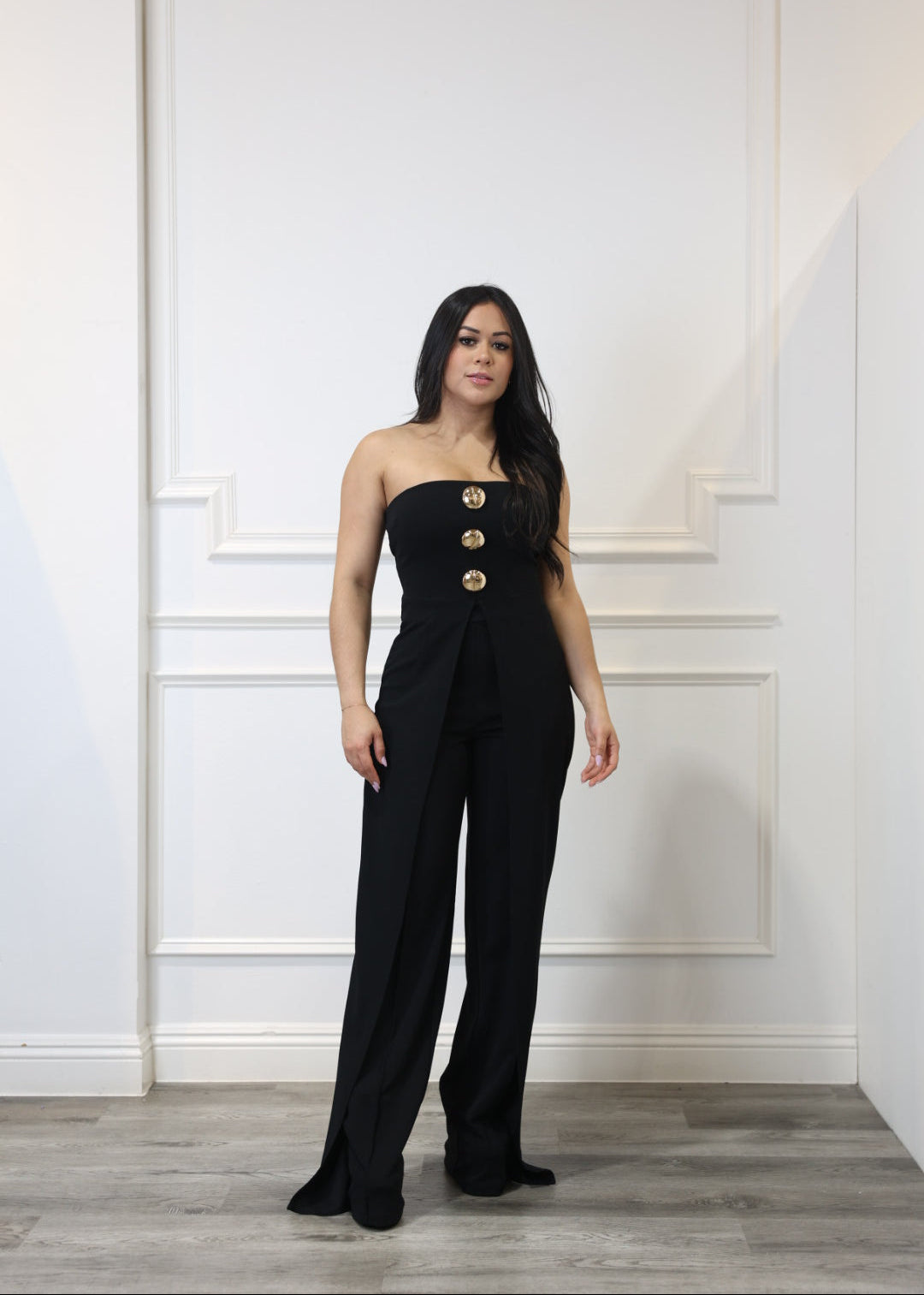 This strapless jumpsuit hugs your figure with a stretch fit and features a structured bust with silicone grip and elastic for all-day comfort. Designed with bold front buttons and a straight-leg silhouette, it includes a layered pant detail for added flair. Finished with a hidden back zipper for a seamless look.