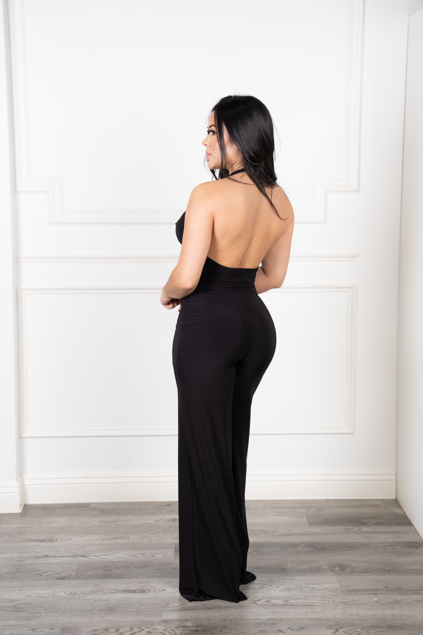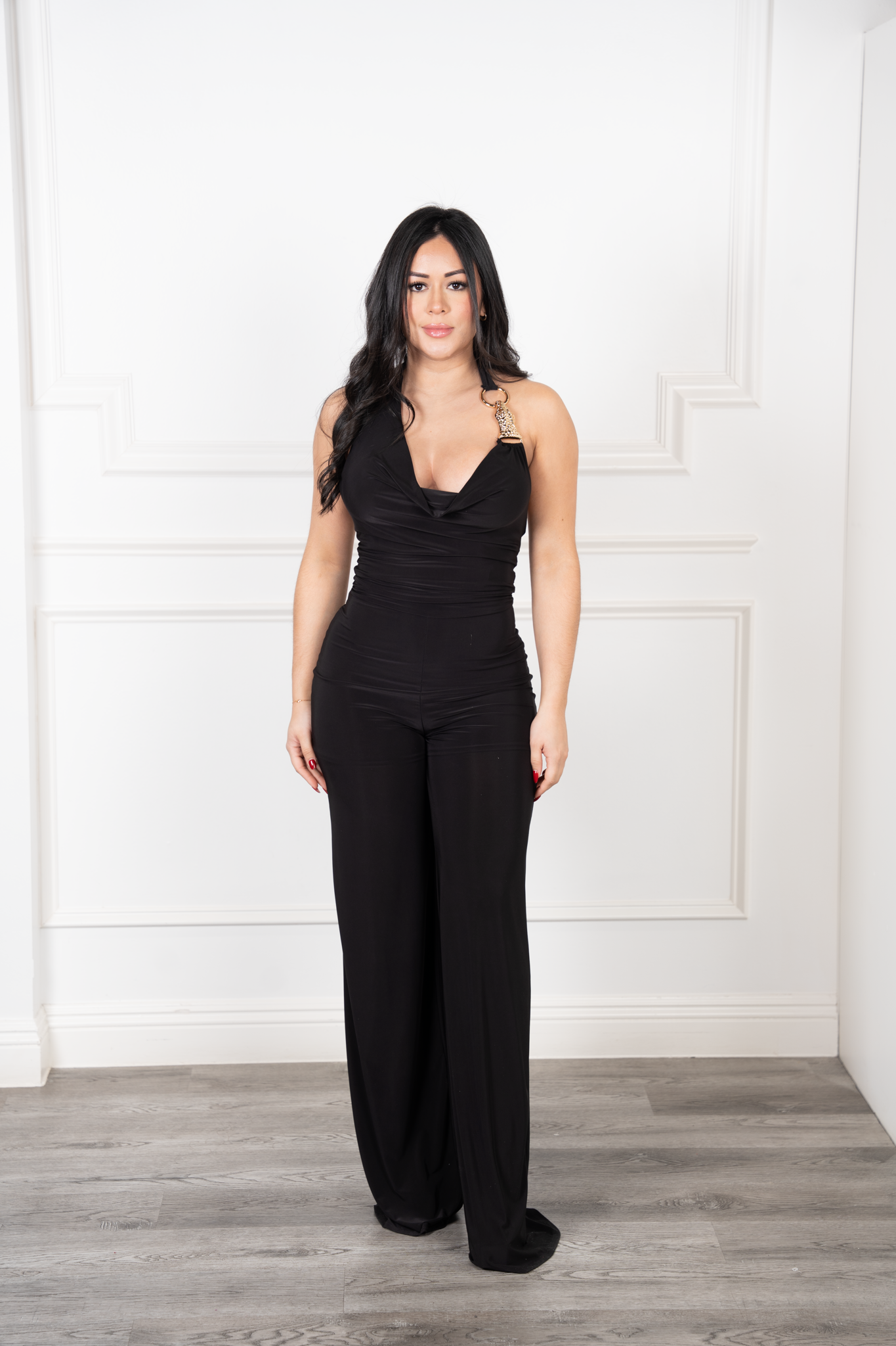 Vico-Black Halter Jumpsuit With Cowl Neck And Snake Metal Trim