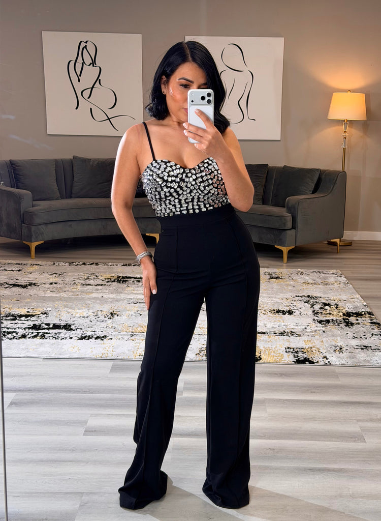 Filipa - Black Romper with Square Stone Embellishments