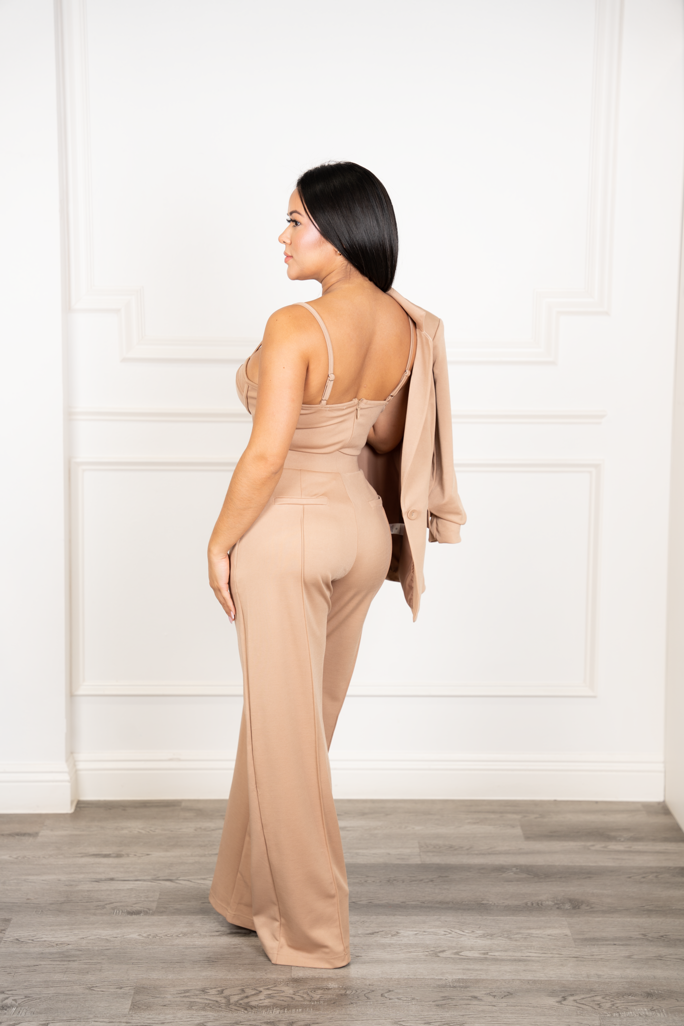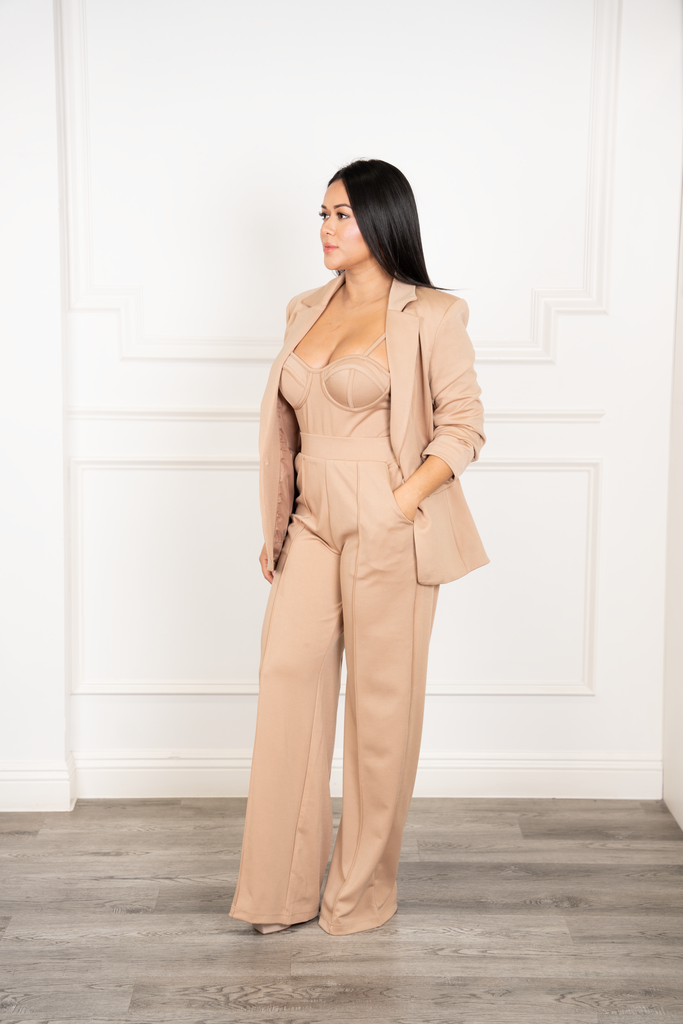A versatile three-piece set featuring a 3/4 sleeve blazer with ruched detail and polo collar, a fitted bodysuit with adjustable straps and built-in cups, and straight-leg pants with side zipper and pockets. Stretch fabric and true-to-size fit deliver comfort, structure, and elegance in one.