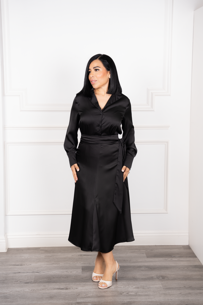 Chic and timeless, this satin two-piece set features a long-sleeve blouse with a polo-style collar and front button closure, paired with a flowy midi skirt. The skirt is designed with a flattering A-line cut, side zipper, and adjustable ties that create a beautiful bow detail, finished with delicate ruffles for added elegance. Perfect for formal occasions or elevated everyday style.