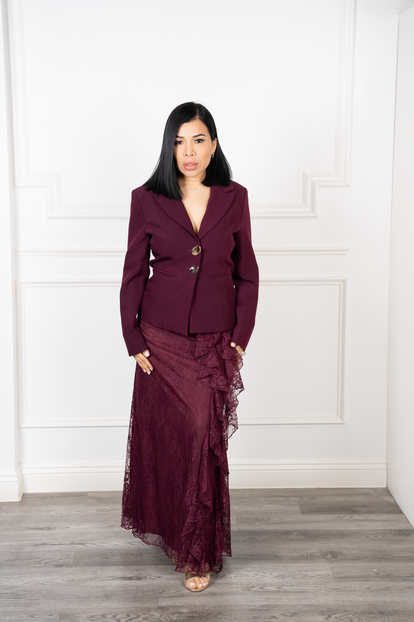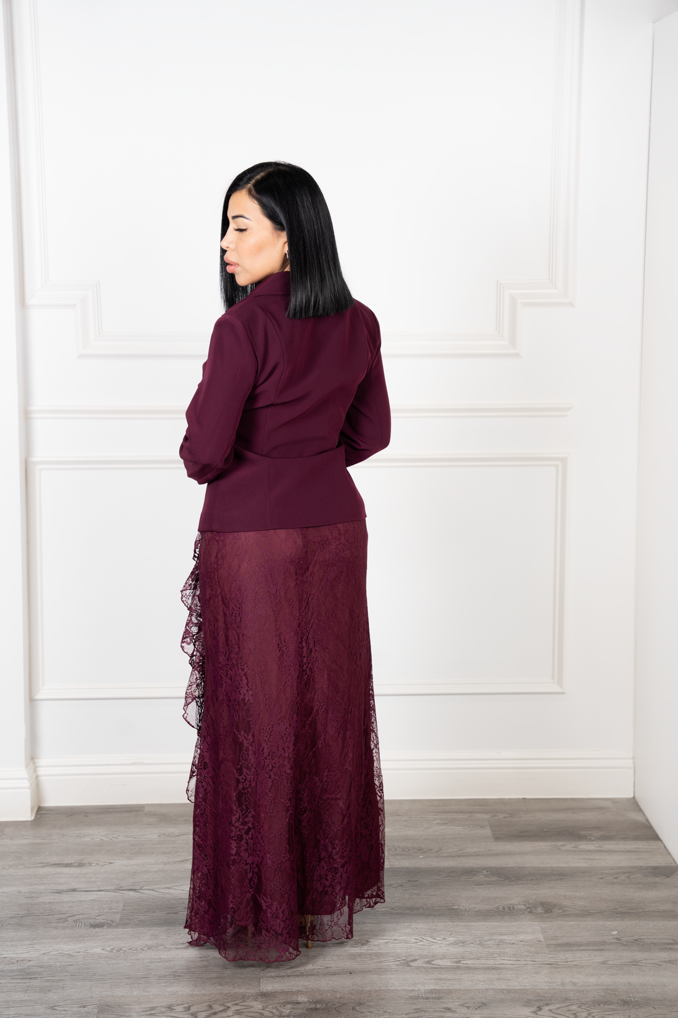 Tiara-Burgandy Pearl Button Blazer And Lace Ruffle Skirt Set