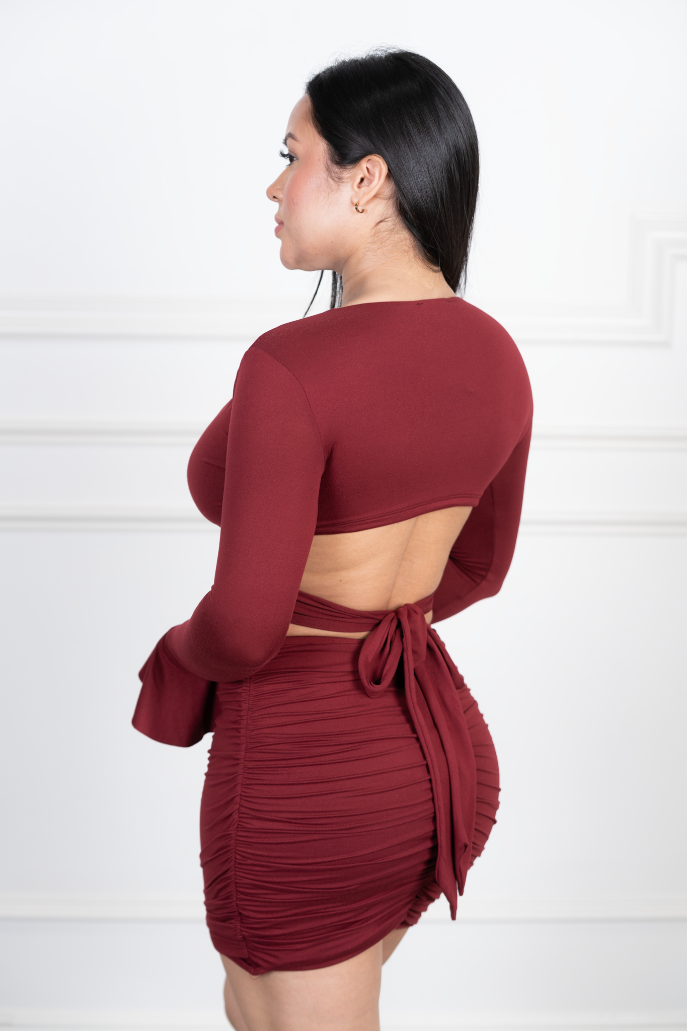 A stylish two-piece set featuring a long-sleeve crop top with a daring plunge neckline, side ties, and a unique front clasp detail, paired with a ruched mini skirt. Double-layer stretch fabric ensures comfort, coverage, and a flattering true-to-size fit.