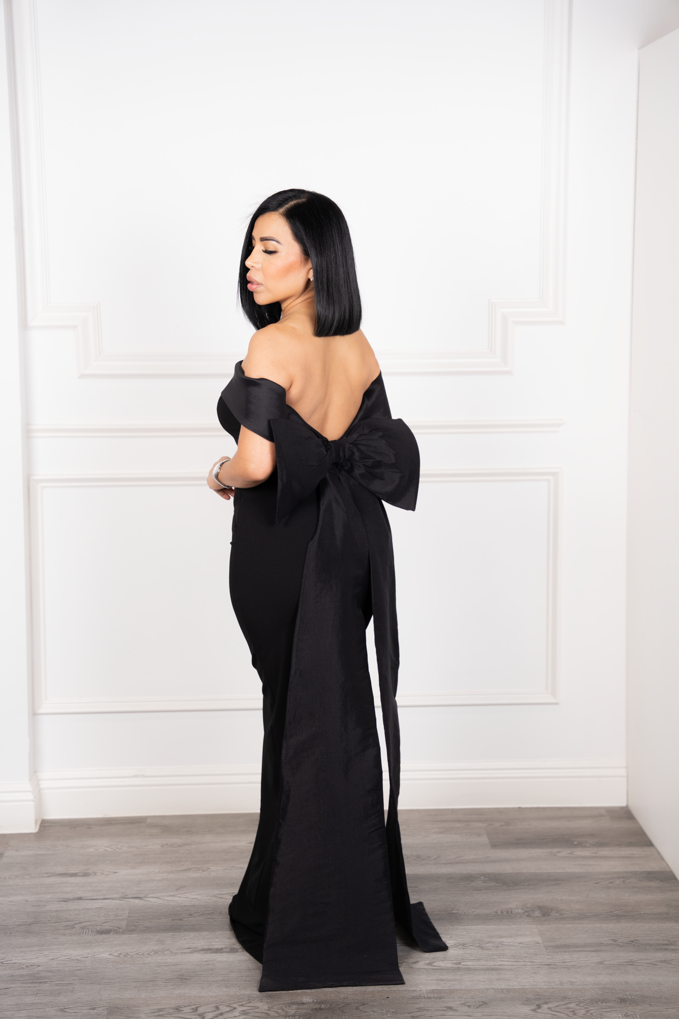 This form-fitting evening gown features a sleek pencil silhouette with a strapless neckline and a single off-shoulder strap for a touch of asymmetry. The back steals the spotlight with a dramatic oversized bow at the lower back, finished with flowing ribbon-like tails. A subtle slit at the calf adds movement, while the side zipper ensures a smooth, tailored fit. Crafted from premium stretch fabric with contrast textures for an elevated finish.
