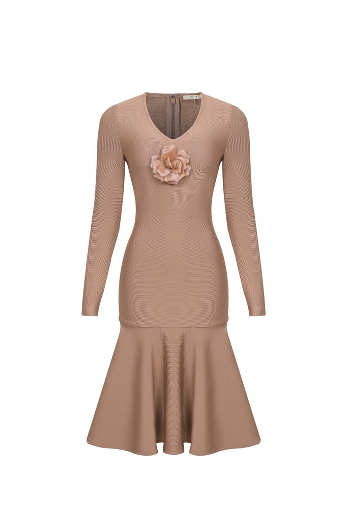 Luciana - Nude V-Neck Mermaid Cut Midi Dress