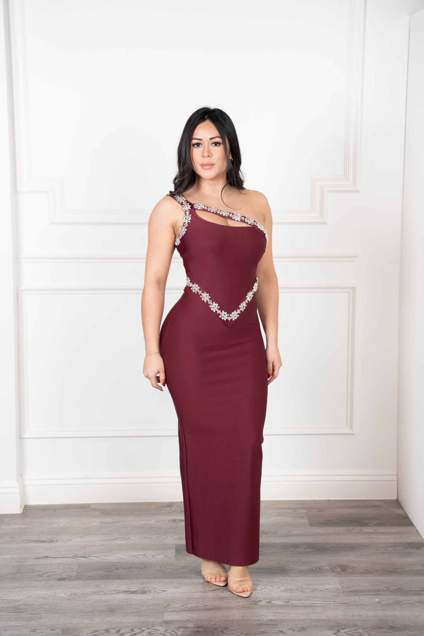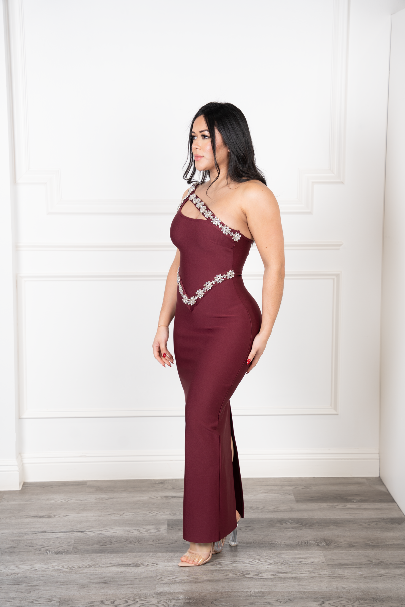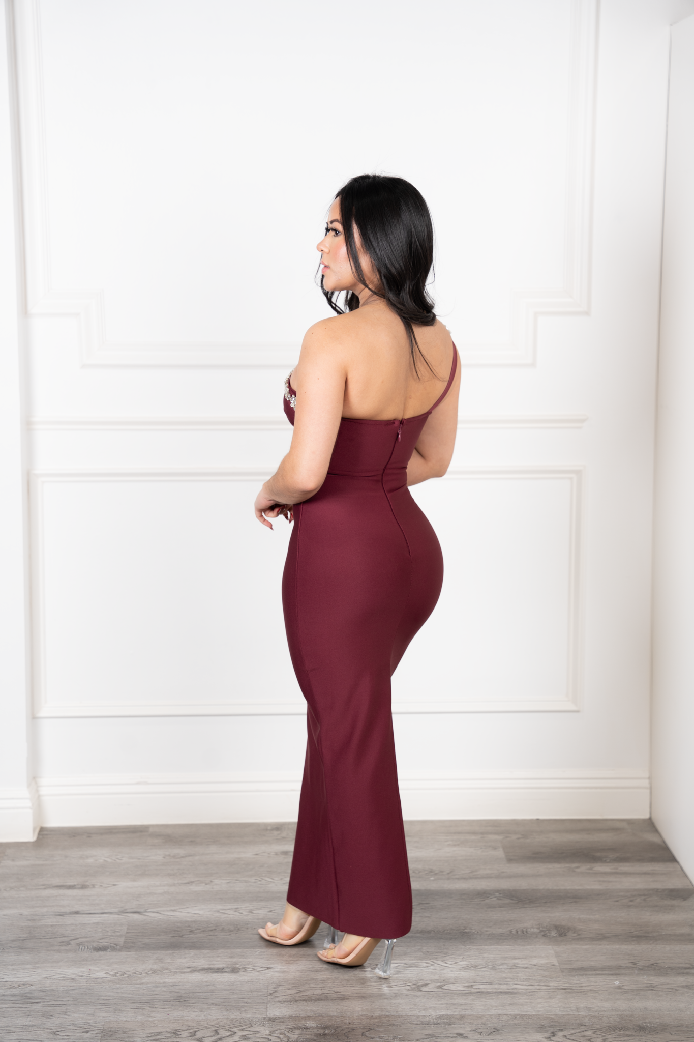 Catalina-Burgandy Asymmetrical Bandage Midi Dress