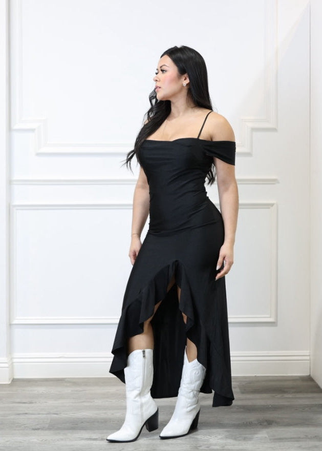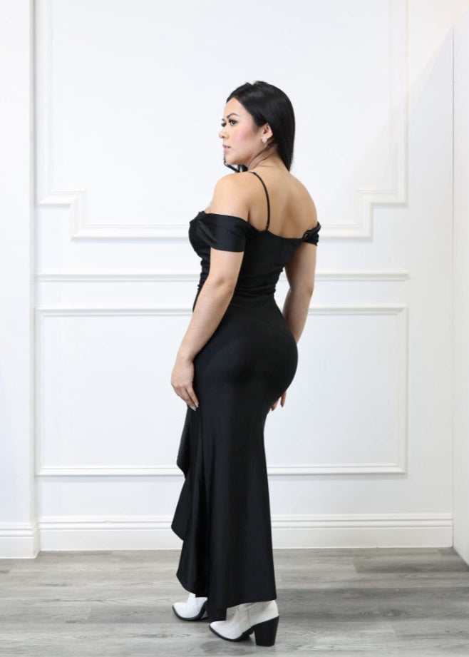 A beautiful long dress featuring adjustable straps, padded cups, and off-shoulder draped straps for a soft, romantic touch. Designed with ruched detailing across the front and a flowy ruffle accent along the left-leg slit for effortless elegance.
