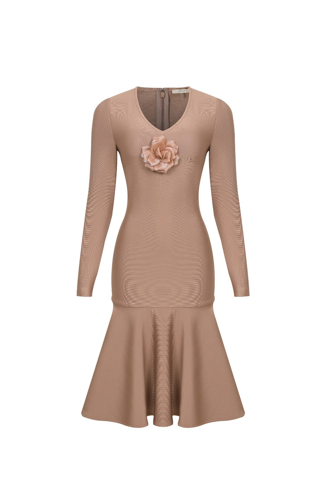 Nude bandage dress. Made with a soft and elastic fabric that enhances your silhouette, this dress features a flattering V-neck and long sleeves for a refined touch p. The highlighted detail,a delicate fabric flower on the bust, adds a romantic and sophisticated accent. In skirt it creates an elegant and feminine mermaid skirt finish which makes it perfect for elegant dinners, cocktail or special occasions.