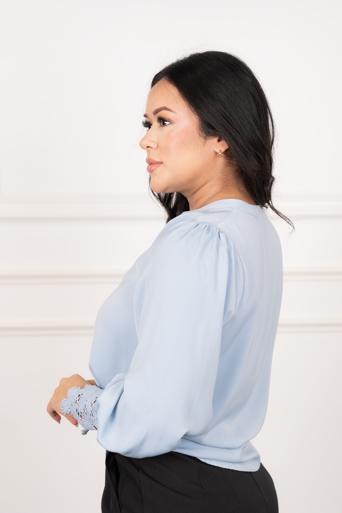 An elegant formal blouse featuring a high round neckline, long sleeves with lace embroidery at the cuffs, and matching fabric buttons along the front. Its oversized non-stretch design combines sophistication with timeless charm.