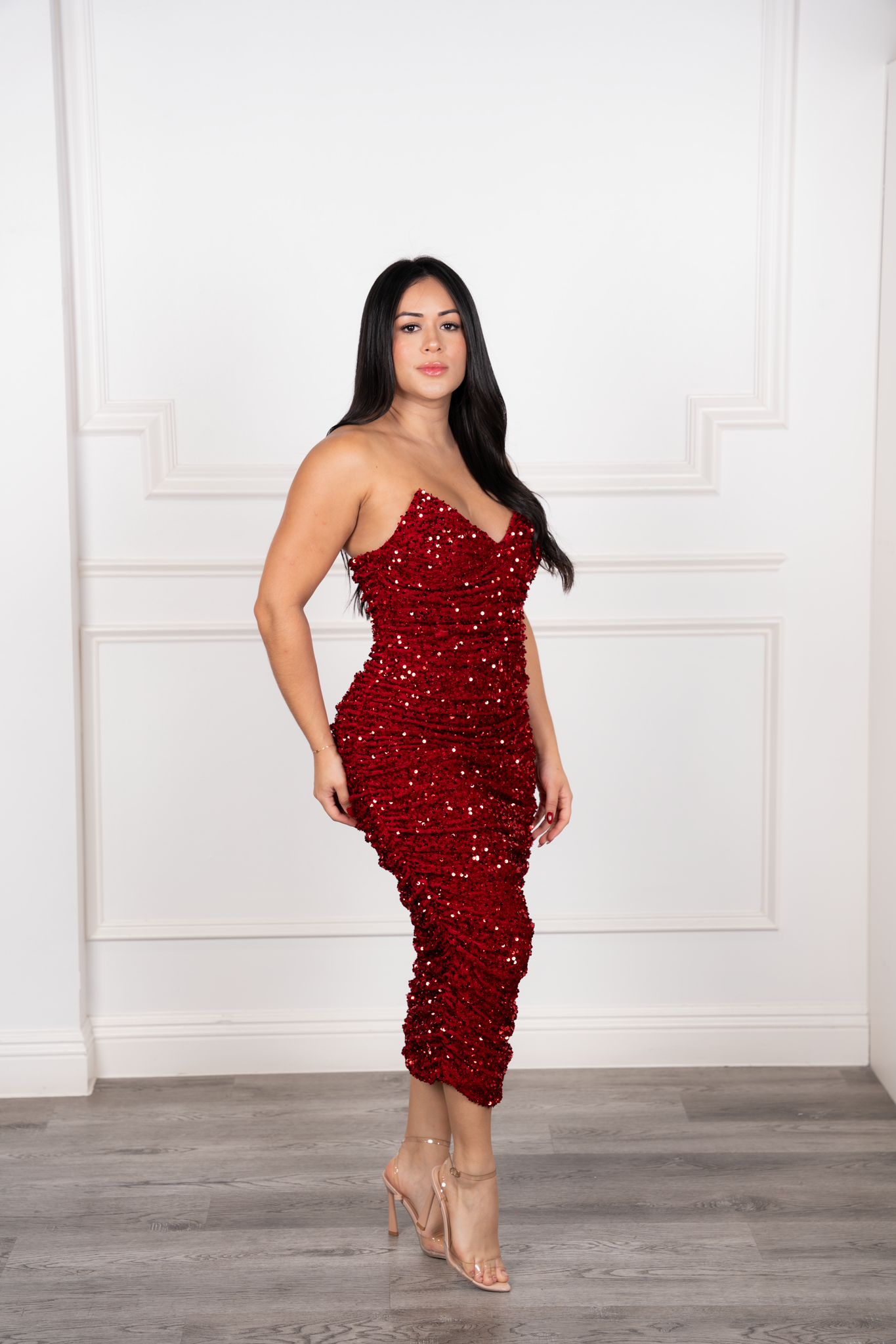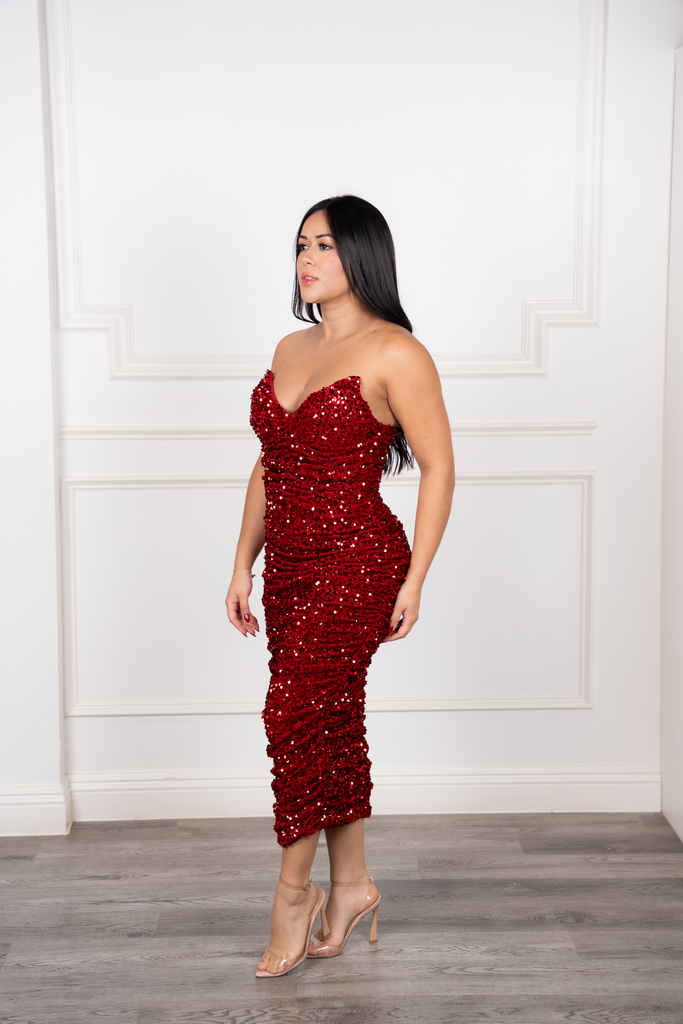 The Aria Strapless Dress is a dazzling piece made to shine. Designed with a sweetheart neckline featuring a chic triangular finish, it is crafted with built-in cups and silicone lining for a secure, flattering fit. The side ruching enhances your curves, while the all-over sequin embellishment adds the perfect touch of glamour. Fully lined with stretch double fabric, this dress is both comfortable and irresistibly elegant.
