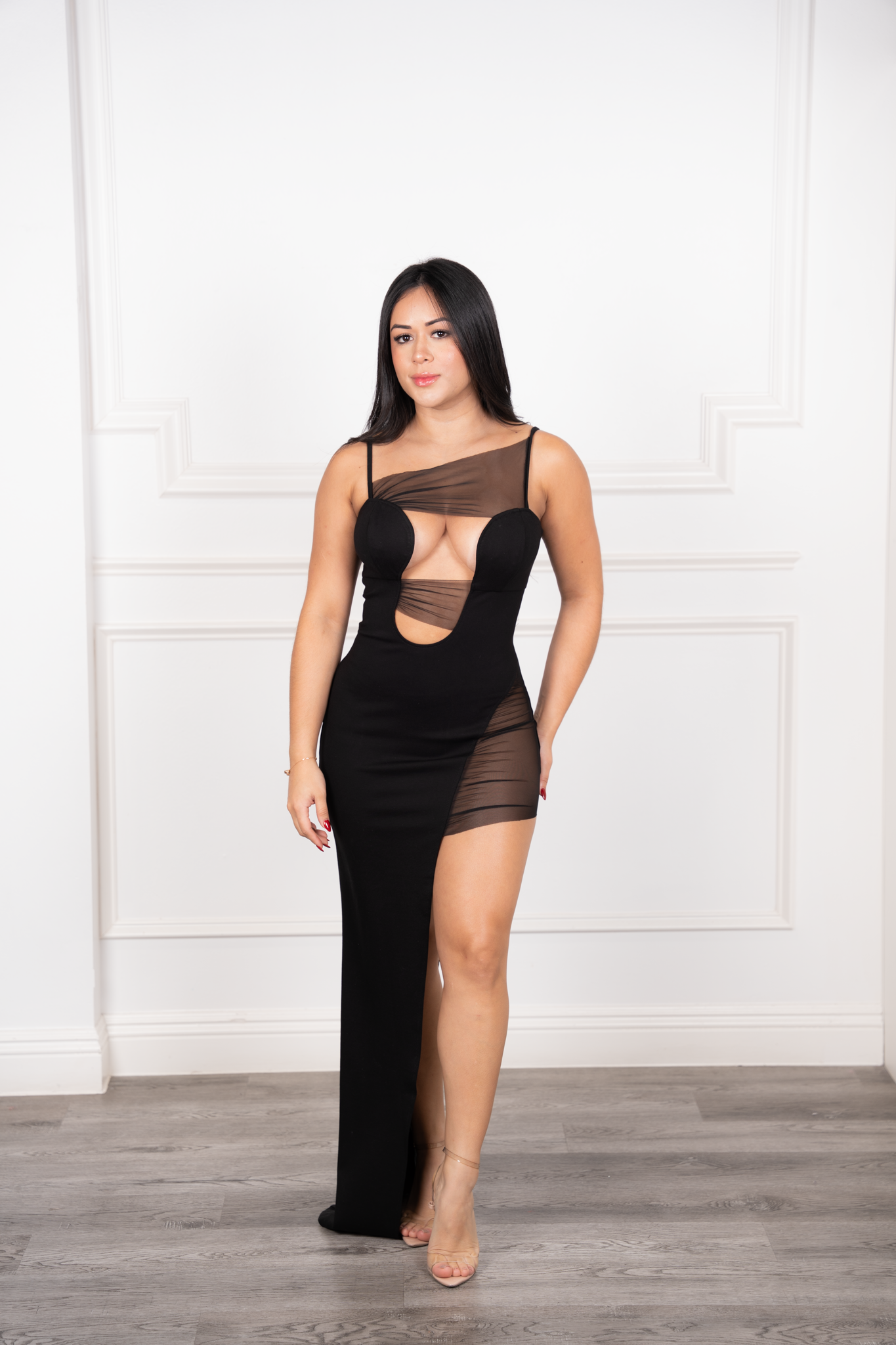The Aurora Maxi Dress is a vision of sophistication and allure. Designed with adjustable straps and a deep sweetheart neckline, it features delicate mesh overlays that cross the chest and accentuate the side slit on the left leg. Crafted in stretch fabric for a flawless fit, this gown is perfect for galas, formal evenings, or any occasion where elegance takes center stage.
