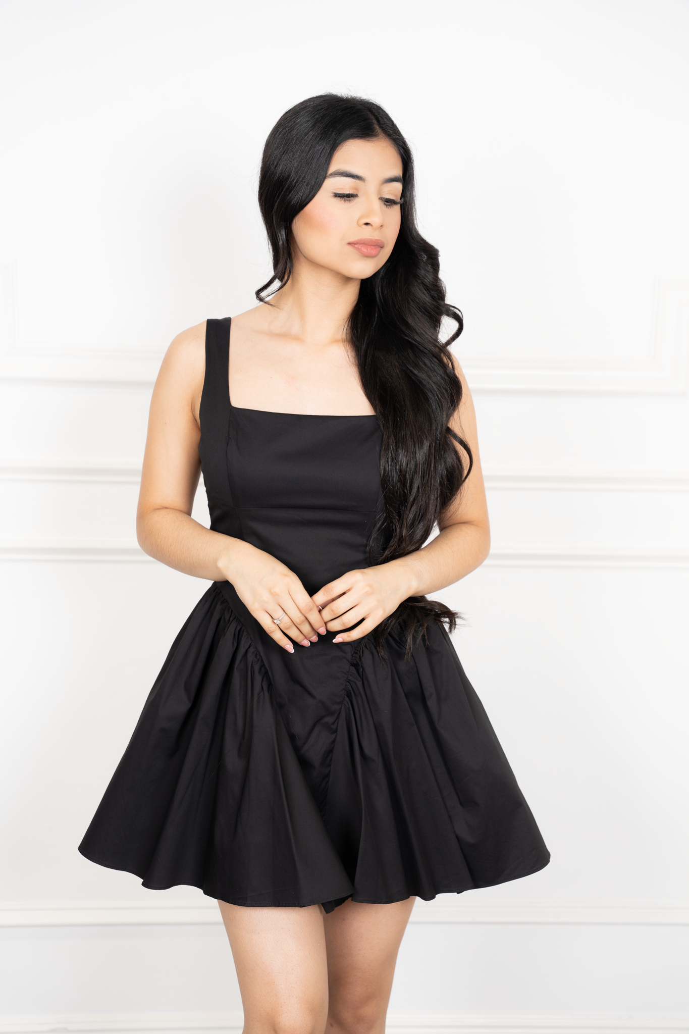 Feminine with a flirty twist, this mini dress features wide straps, a square neckline, and a dramatic open back tied with a delicate bow. The voluminous skirt is enhanced with tulle lining at the sides for extra flare. Stretchy, double-lined, and zipped in the back—ready to twirl!