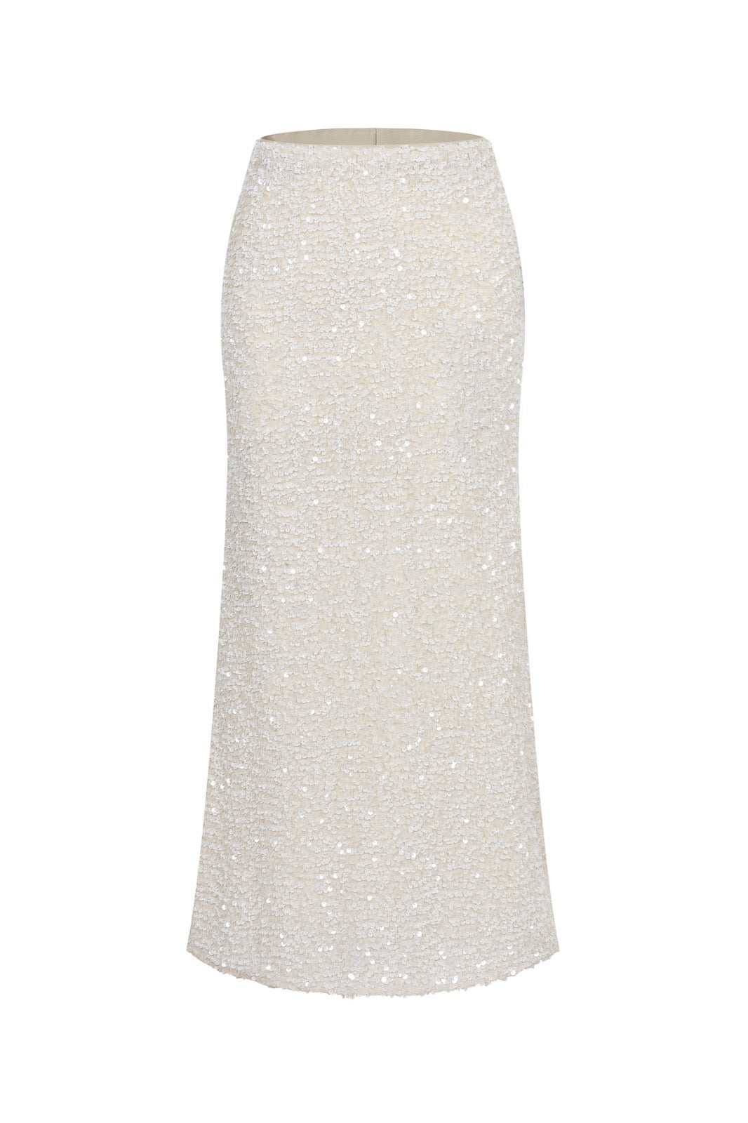 Shine all night in this stunning ivory sequin midi skirt. A guaranteed showstopper, this high-waisted skirt is covered entirely in shimmering sequins that catch the light beautifully.