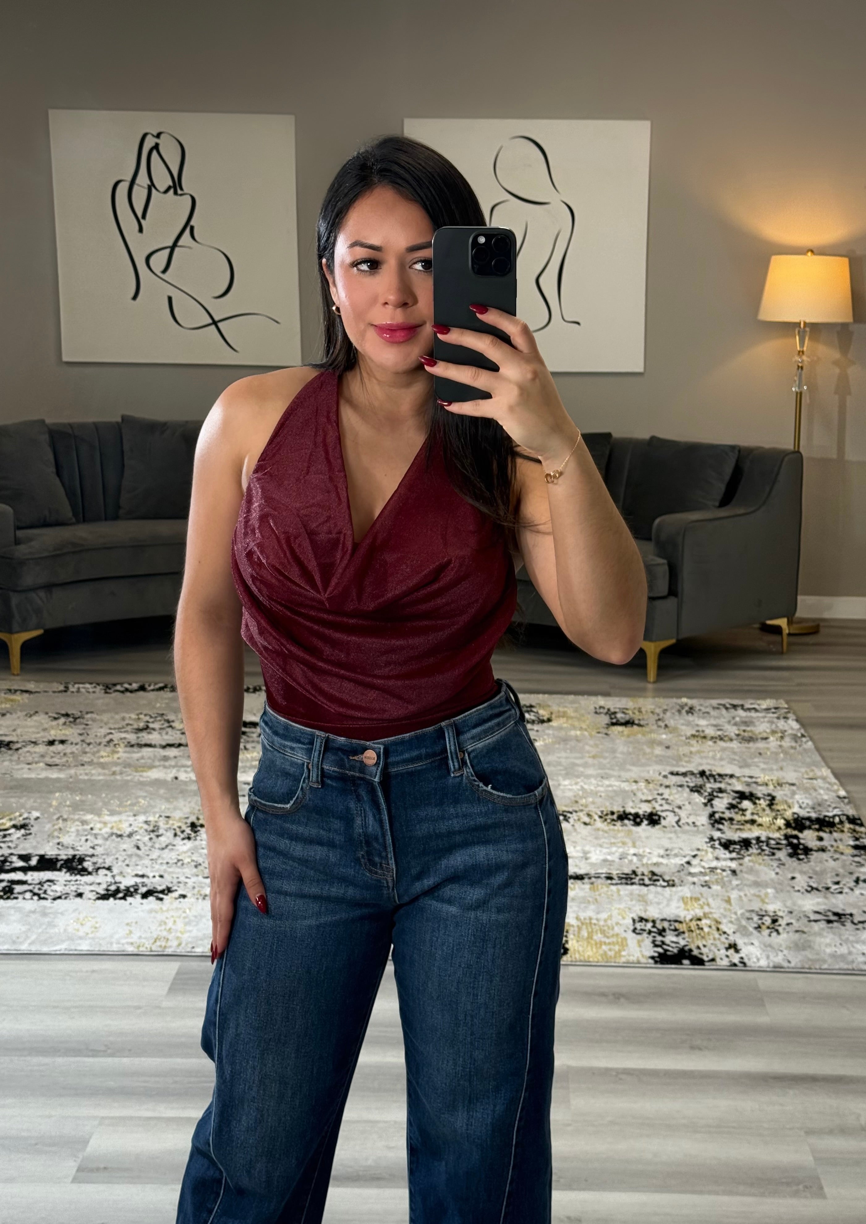 This top is made of transparent mesh fabric, beautifully detailed with metallic sparkles. It offers a draped deep neckline with a halter neck. The elastic and high-quality material ensures a comfortable fit, making it perfect to combine with skirts, pants or layers under jackets.