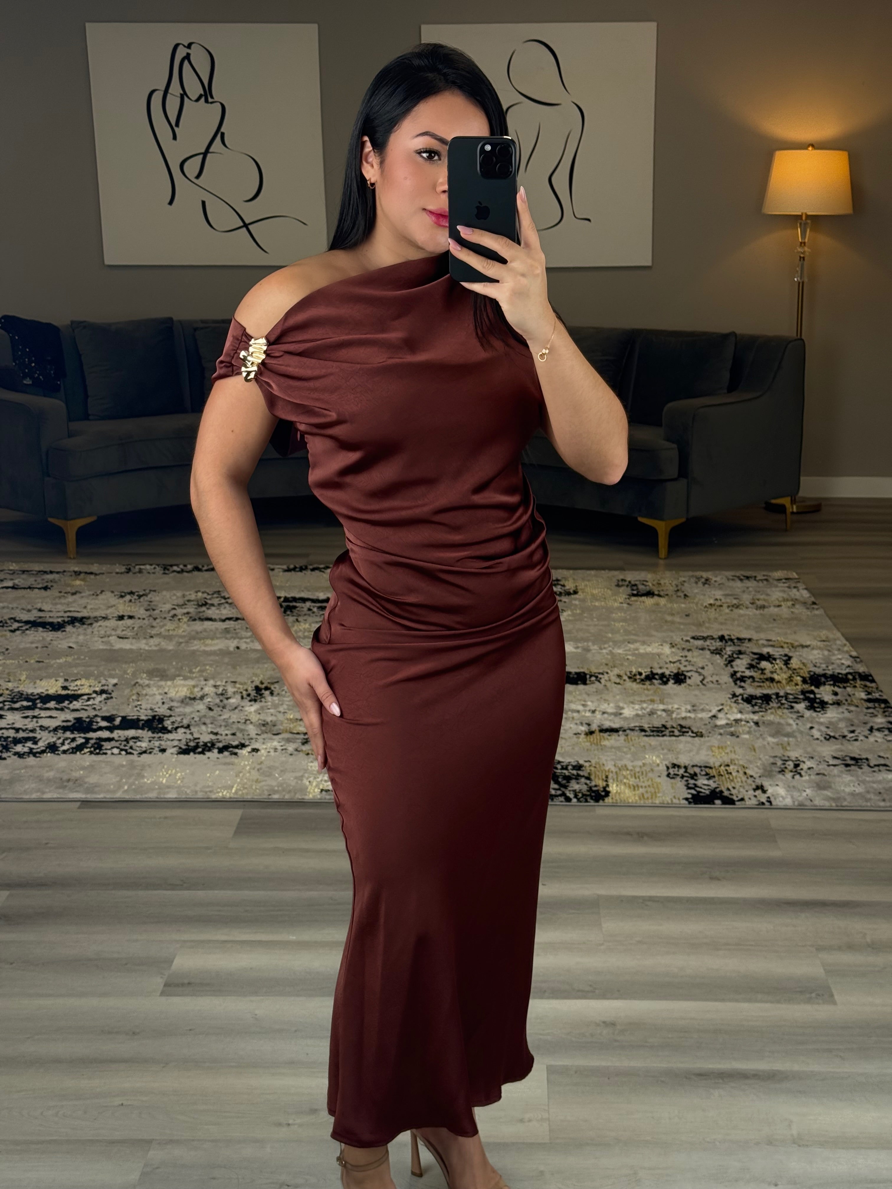 An elegant midi dress with an asymmetrical neckline with style side draped to the shoulder and a silhouette that attracts the body. Handmade in soft elastic satin fabric, zipper side and it is a versatile essential for layers or wear only with elegant confidence.