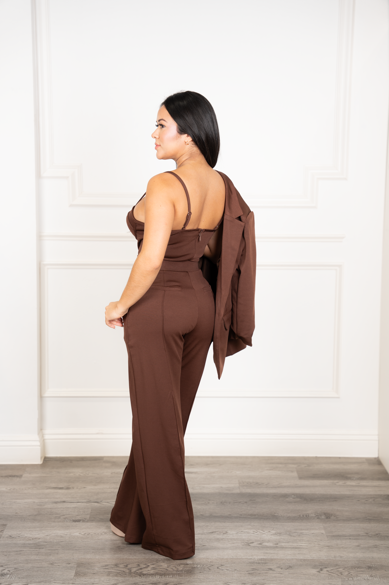 A versatile three-piece set featuring a 3/4 sleeve blazer with ruched detail and polo collar, a fitted bodysuit with adjustable straps and built-in cups, and straight-leg pants with side zipper and pockets. Stretch fabric and true-to-size fit deliver comfort, structure, and elegance in one.