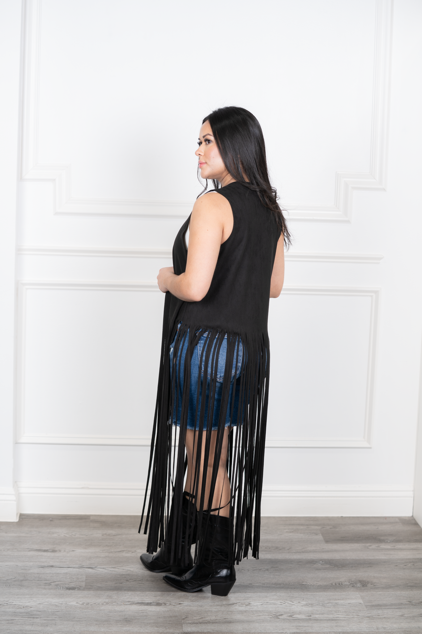 Fiera-Camel Long Fringe Sleeveless Suede Vest - Black / S is backordered and will ship as soon as it is back in stock.