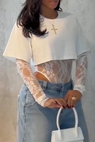 Lia-White Chic Layered Lace Bodysuit T-shirt Two-piece Set