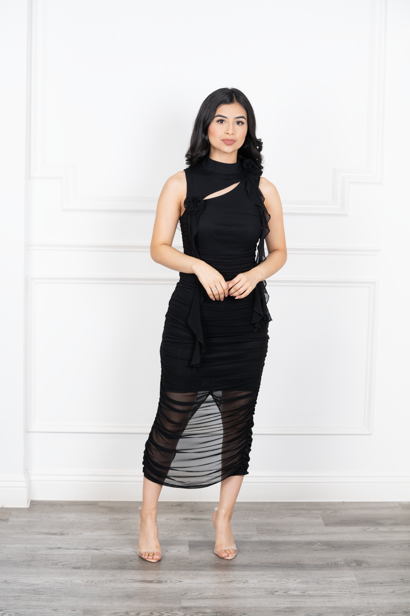 A daring midi dress with a turtleneck and a pencil cut on the gathered sides that enhances the silhouette designed with 3D flowers and loose bows. With a mesh fabric cover, without a zipper, it is a bold but elegant option for exceptional occasions.