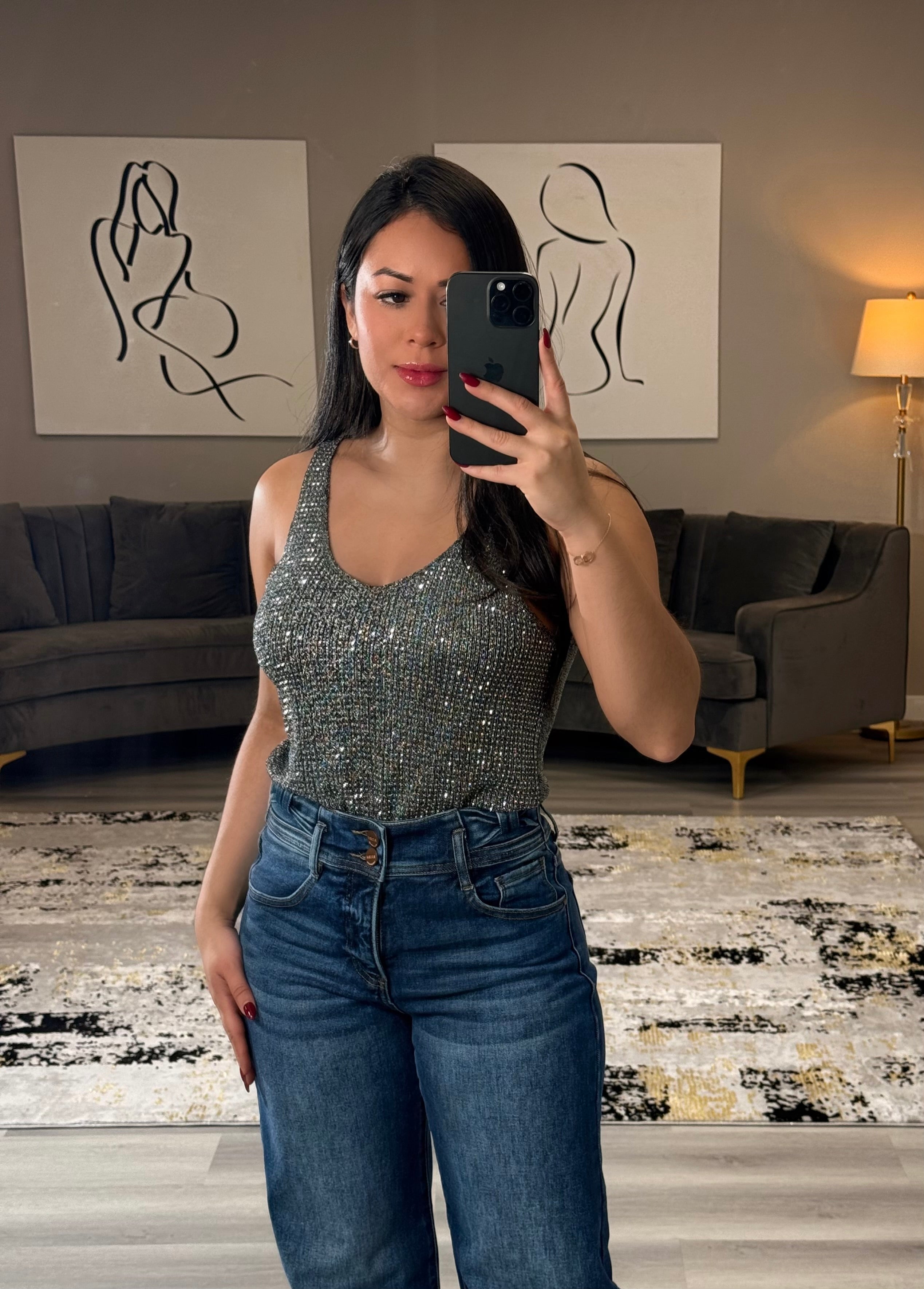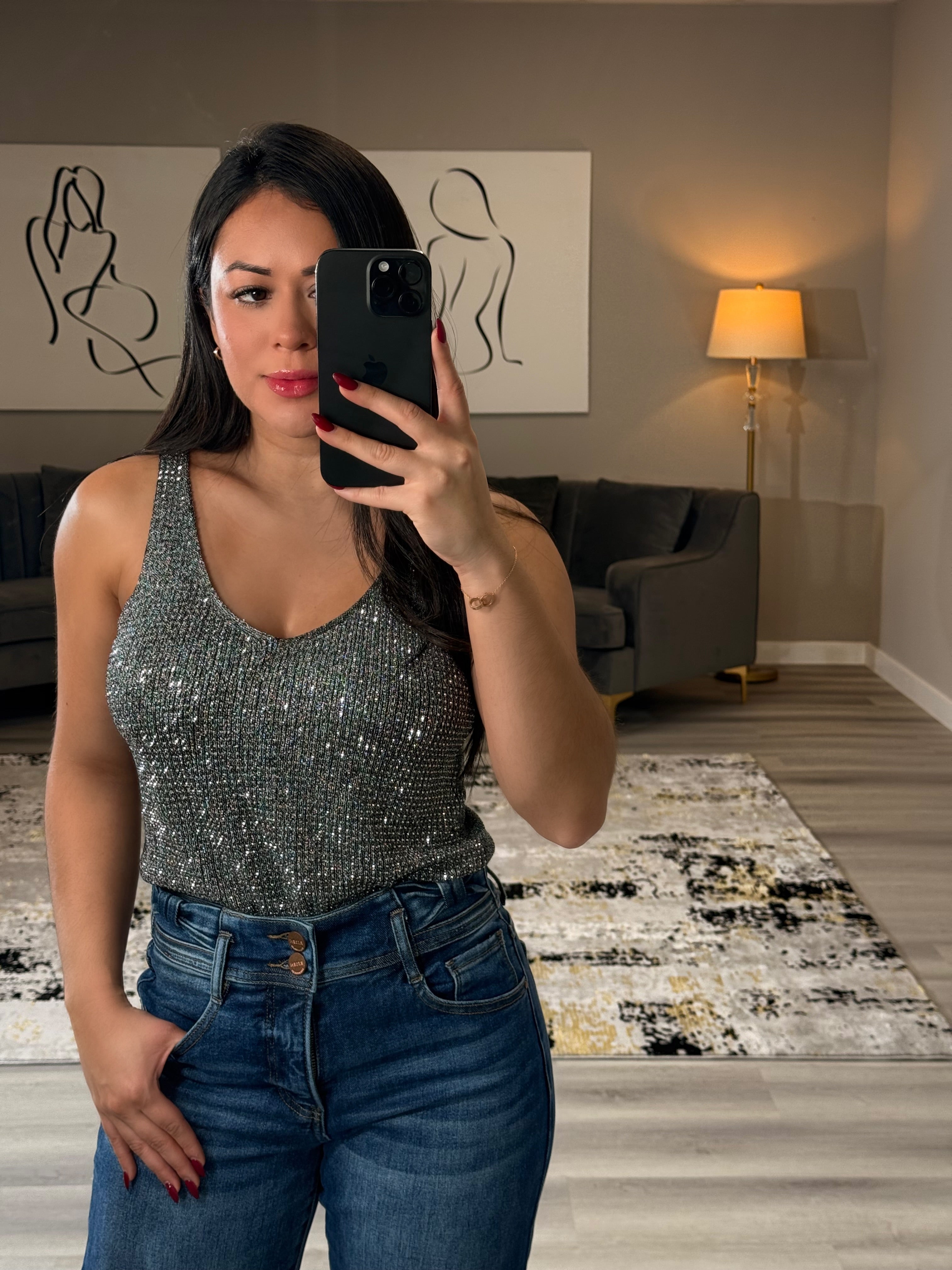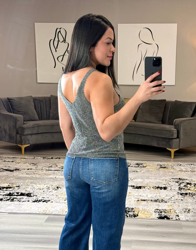 A light knit strap top with a flattering round neckline and front shiny rhinestone design. The perfect layered piece with just the right amount of stretch for daily use.