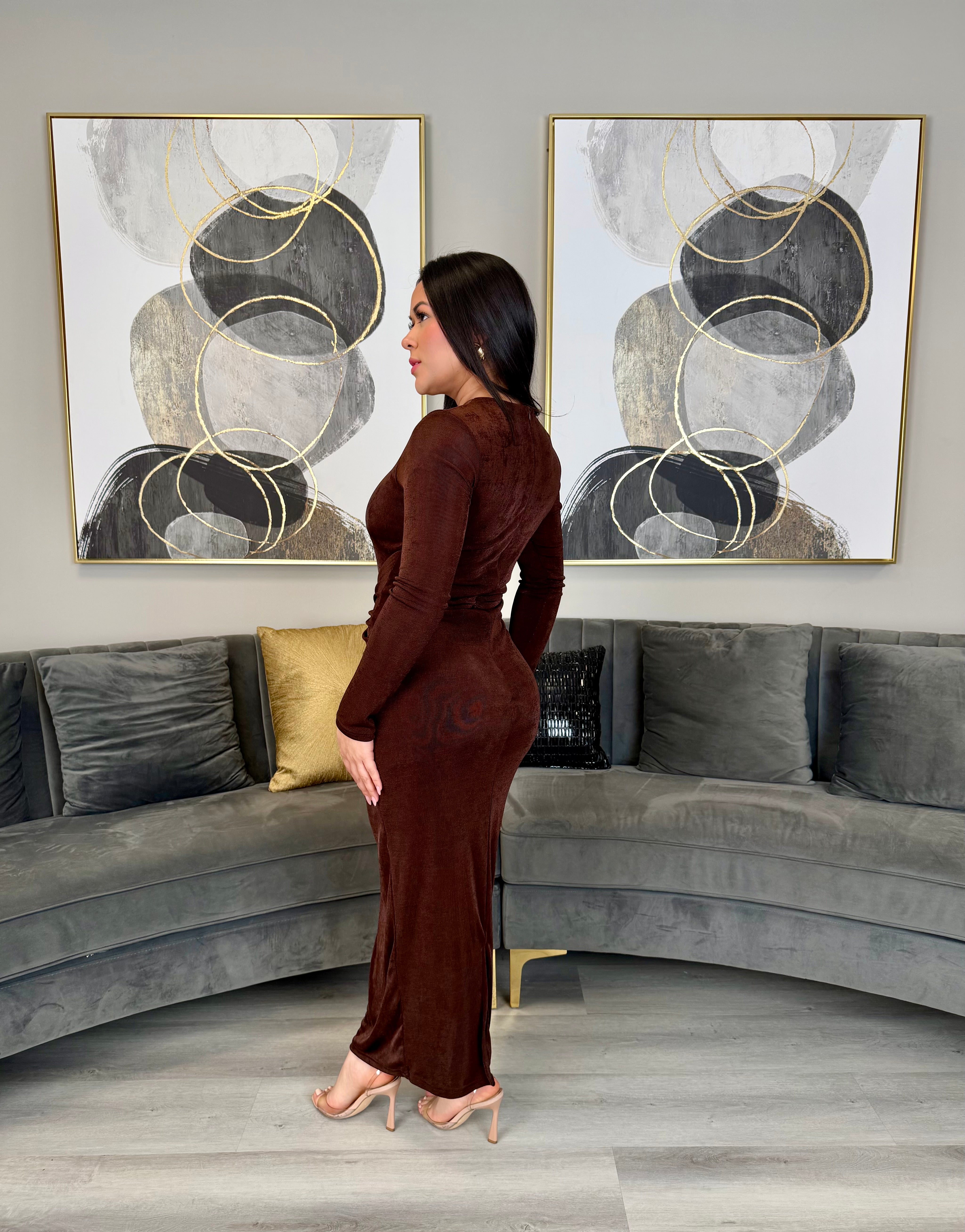 Body-fitting midi dress. Made with a soft and elastic fabric that enhances your silhouette, this dress features a flattering round neck and long sleeves for a refined touch. The highlighted detail, a delicate golden brooch on the abdomen, adds a romantic and sophisticated accent. In the skirt it creates an elegant and feminine pencil skirt finish that makes it perfect for elegant dinners, cocktails or special occasions.