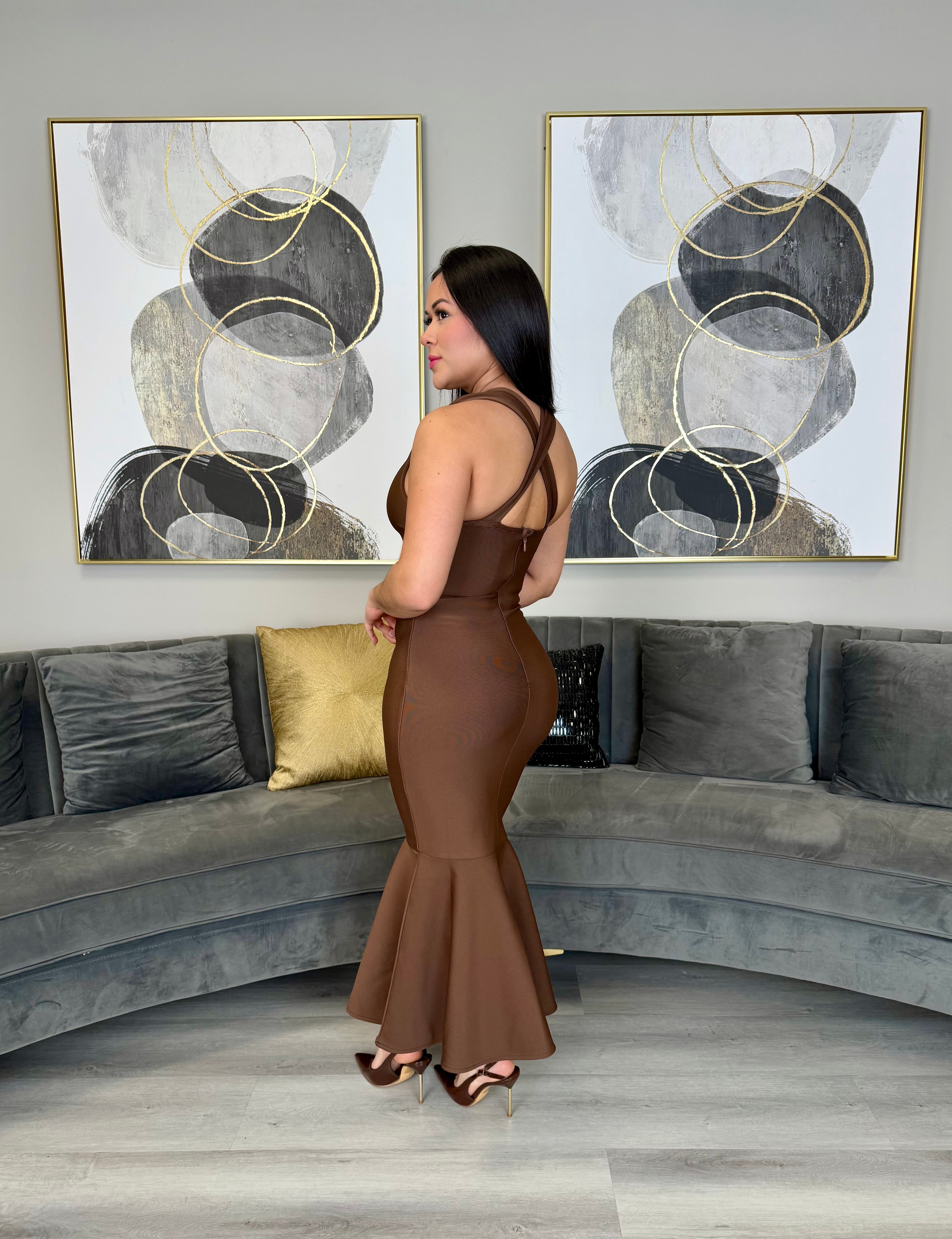 The midi dress embodies pure sophistication with a touch of glamour. Designed with crossed back straps and a round neckline. Its bandage fabric embraces the body in a pencil-cut silhouette, mermaid style while the back opening guarantees an elegant movement. Perfect for galas, formal events or any occasion where timeless elegance is essential.