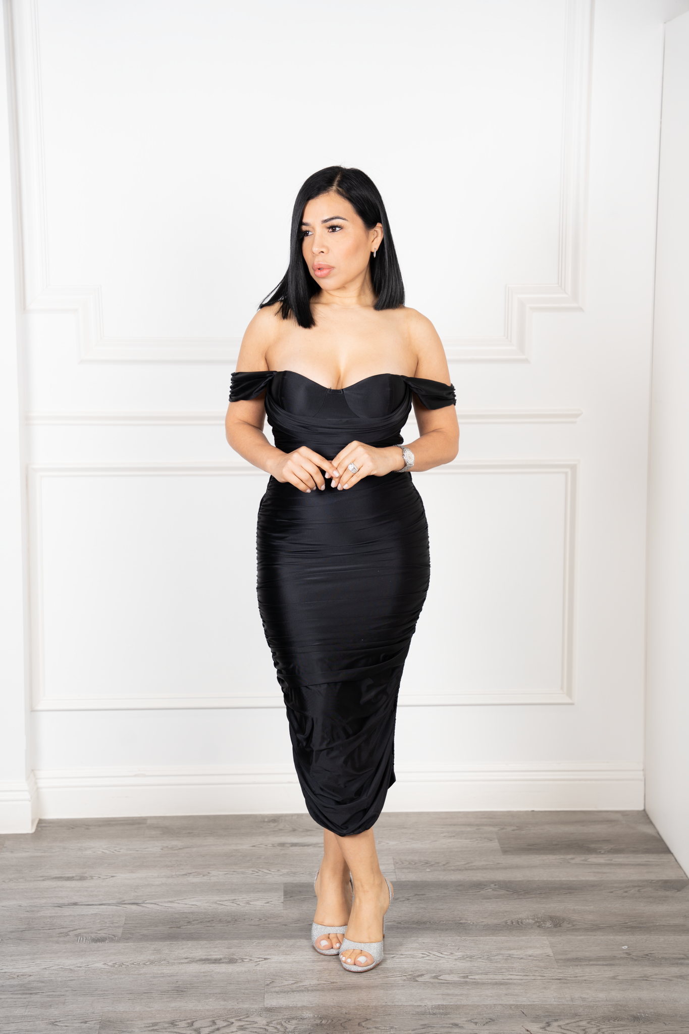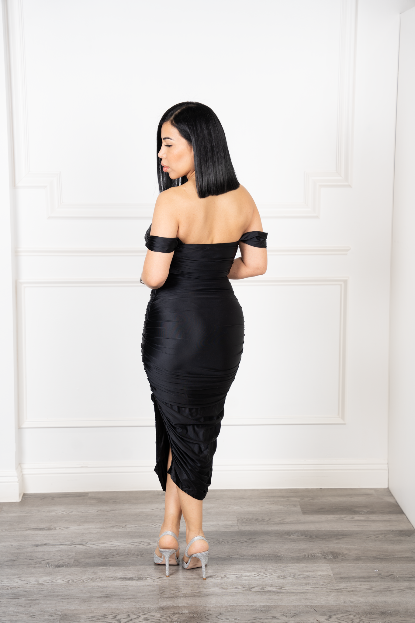 Naty-Black Satin Stretch Off Shoulder Ruched Midi Dress