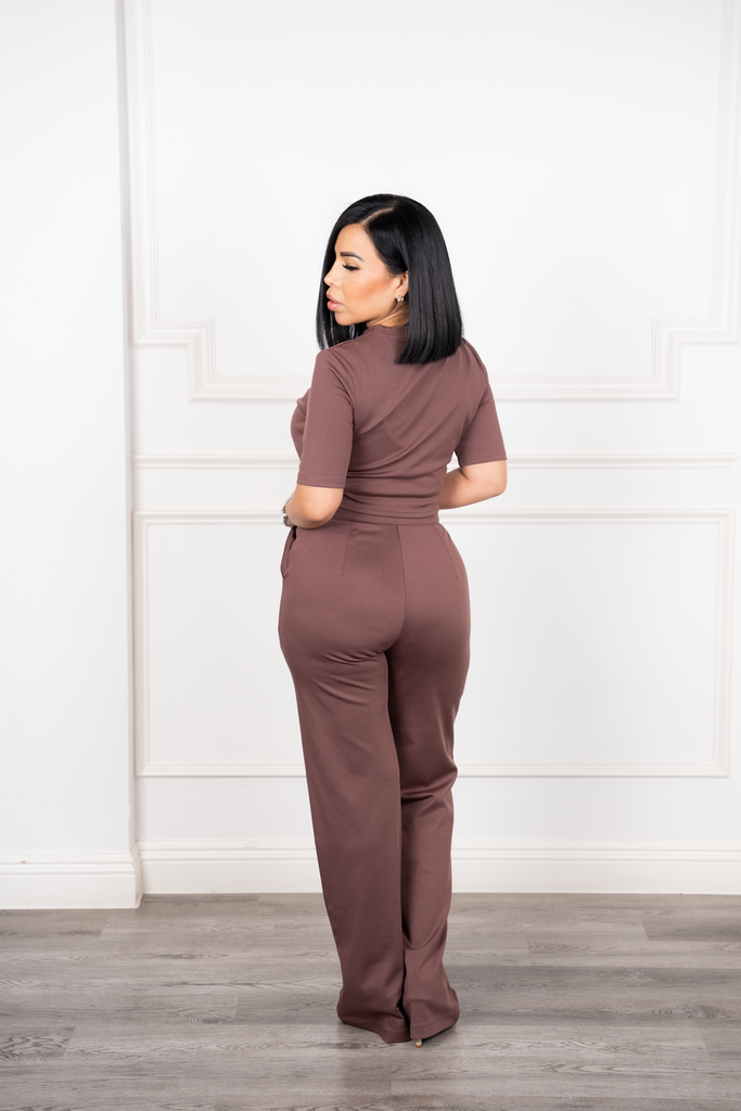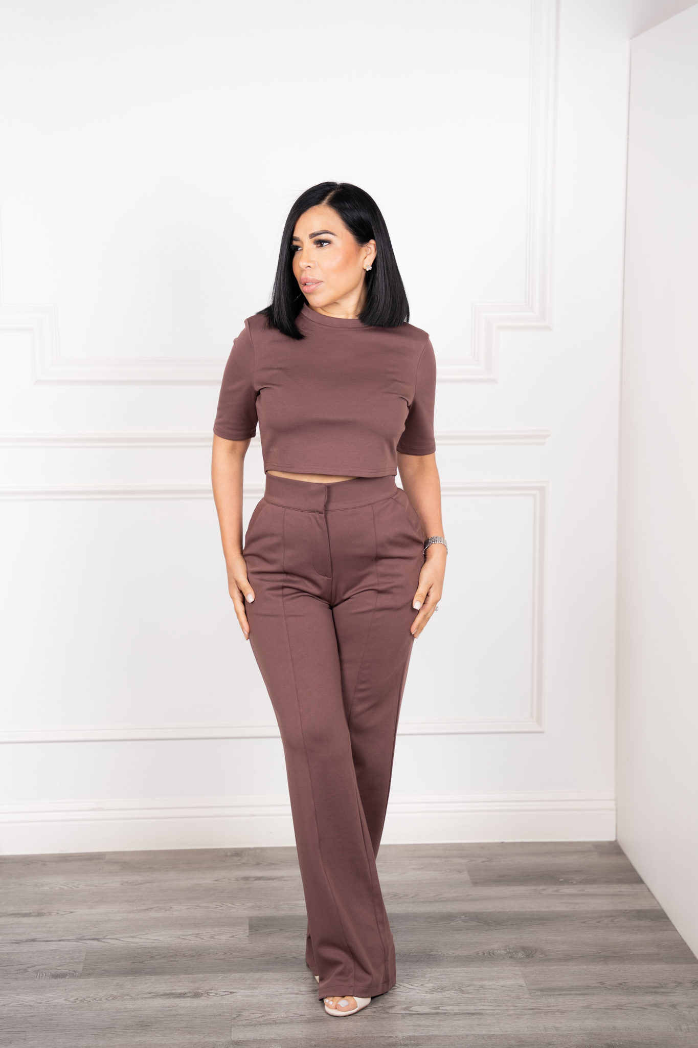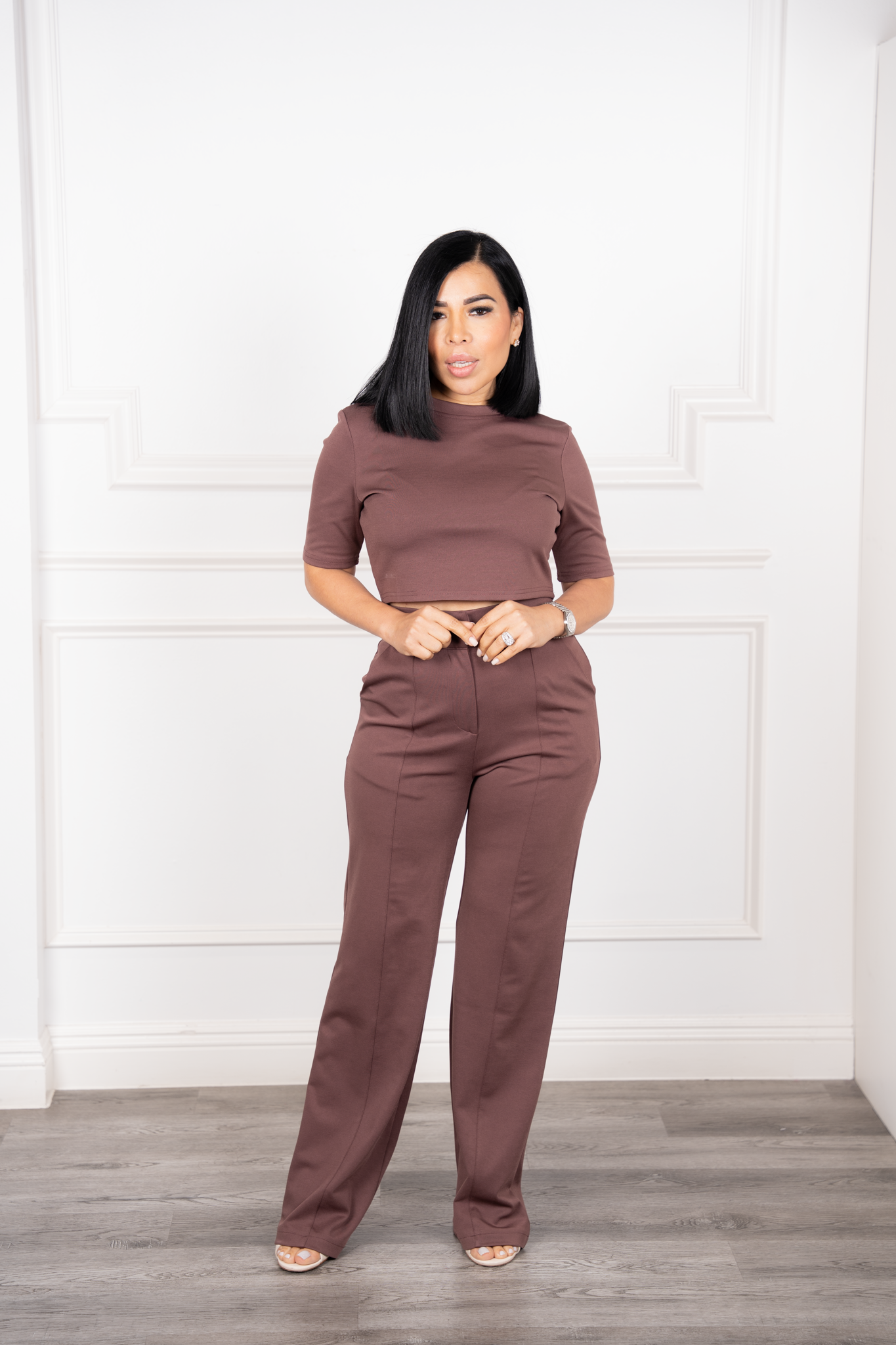This elegant brown set includes a short-sleeve top paired with straight-leg trousers for a polished look. The pants feature a front button and zipper closure with side pockets for practicality, while the stretch fabric ensures comfort and a flattering true-to-size fit. A versatile set that works perfectly for both casual and dressy occasions.