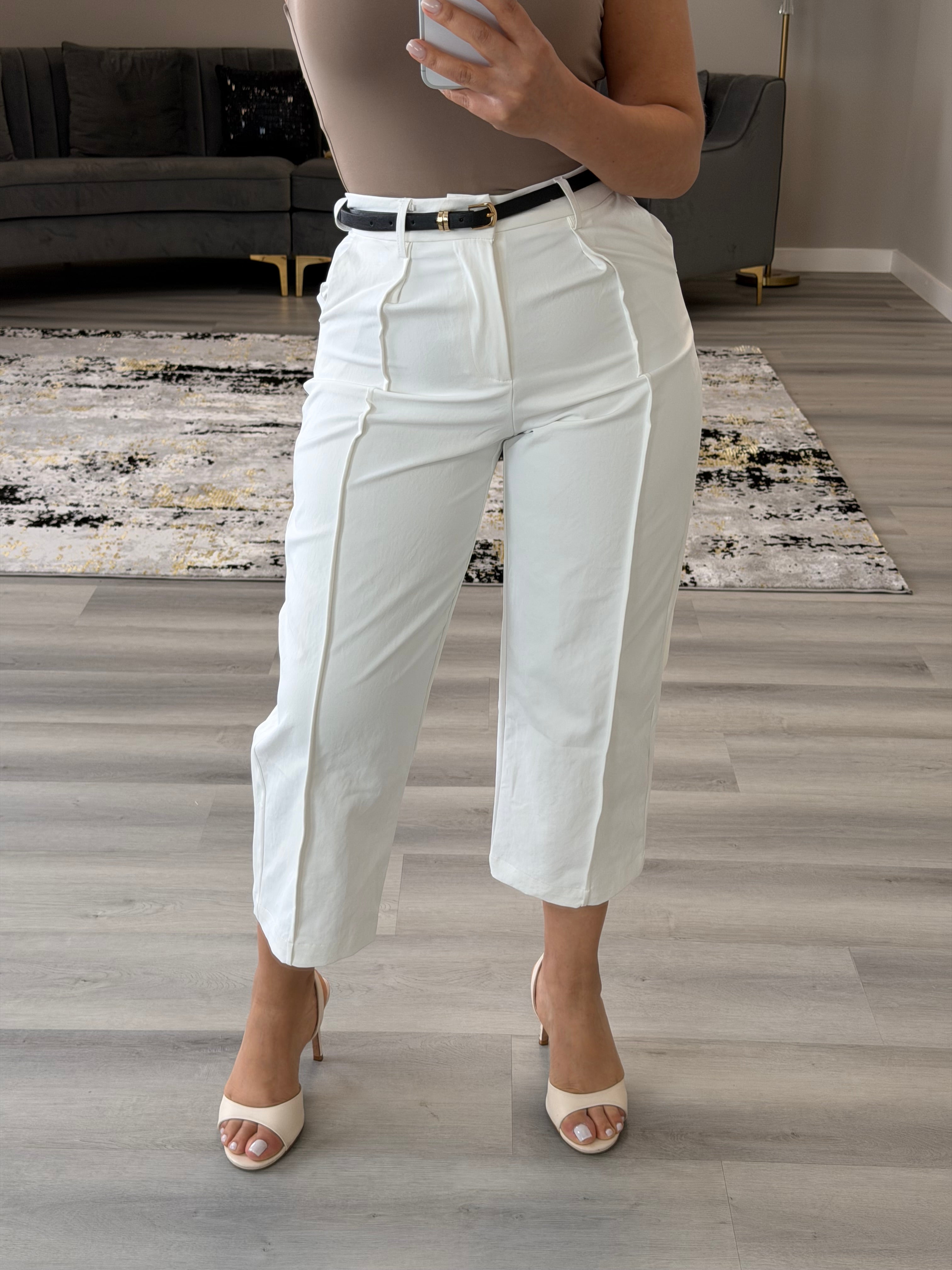Sophisticated capri-style formal pants featuring a wide-leg silhouette, front pleats, and side pockets. Includes a matching belt and front button and zipper closure. Crafted in stretch fabric for structure, comfort, and elegance.