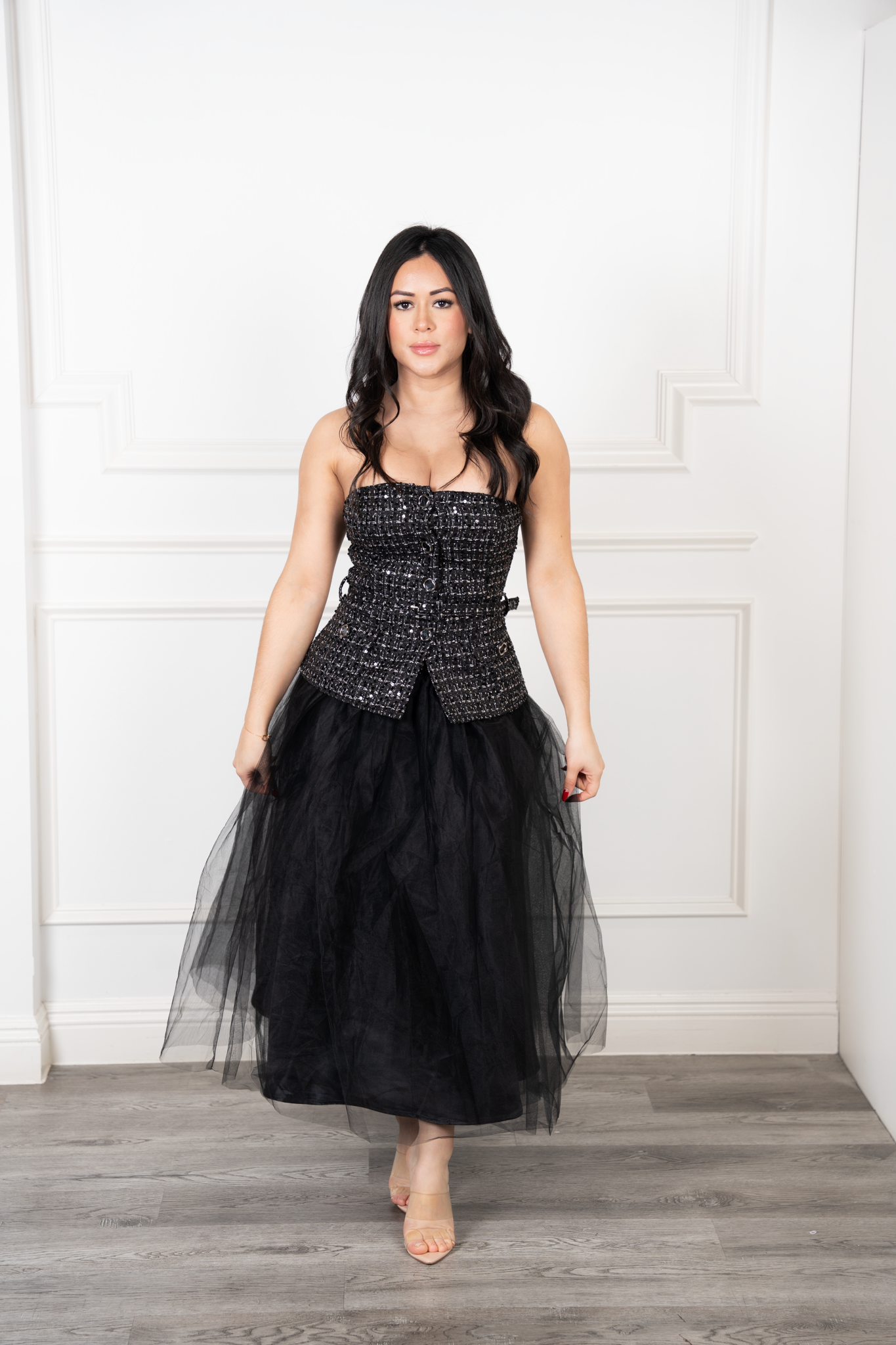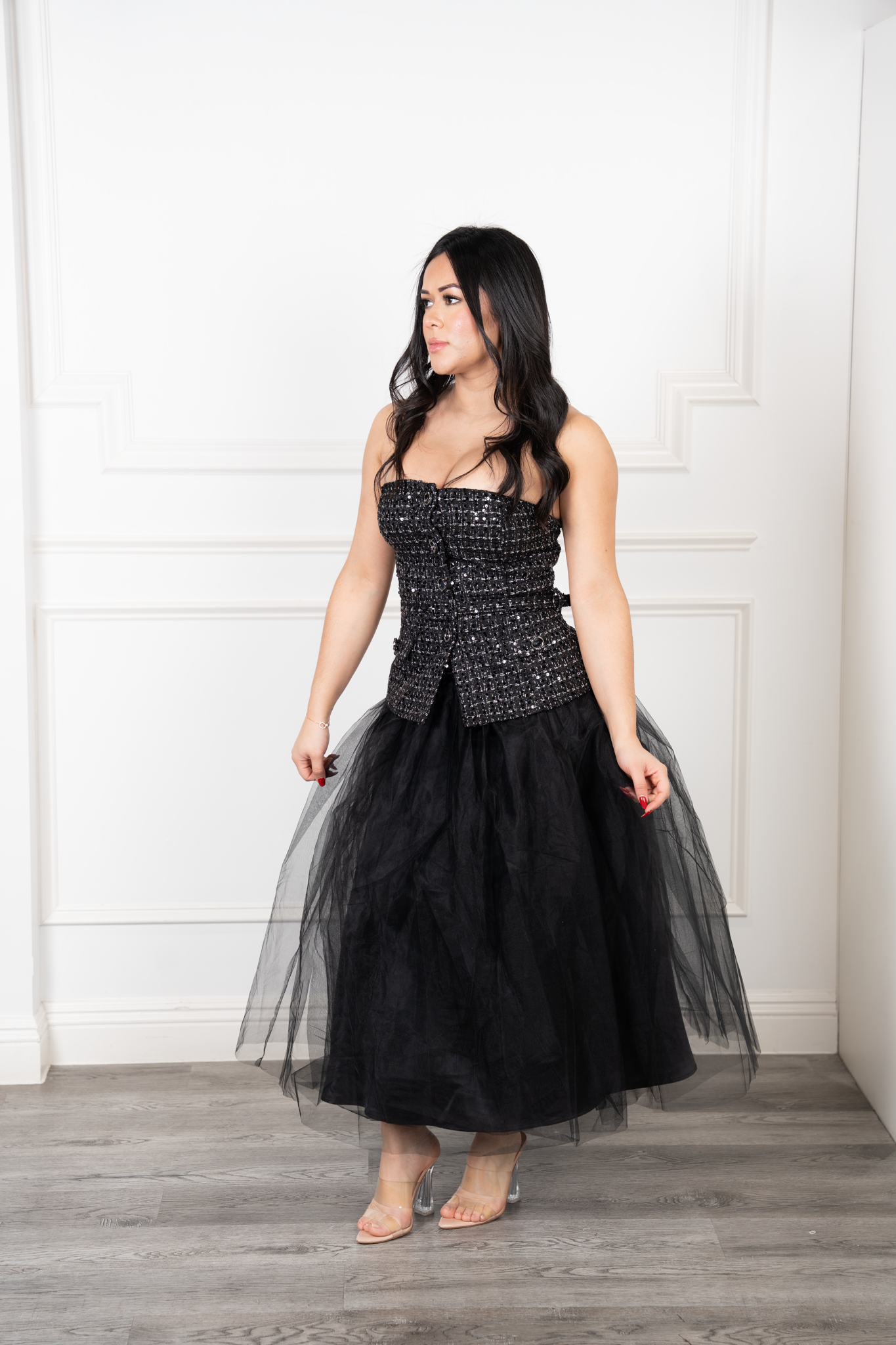 Roxi-Black Tweed Belted Tulle 2pc Set