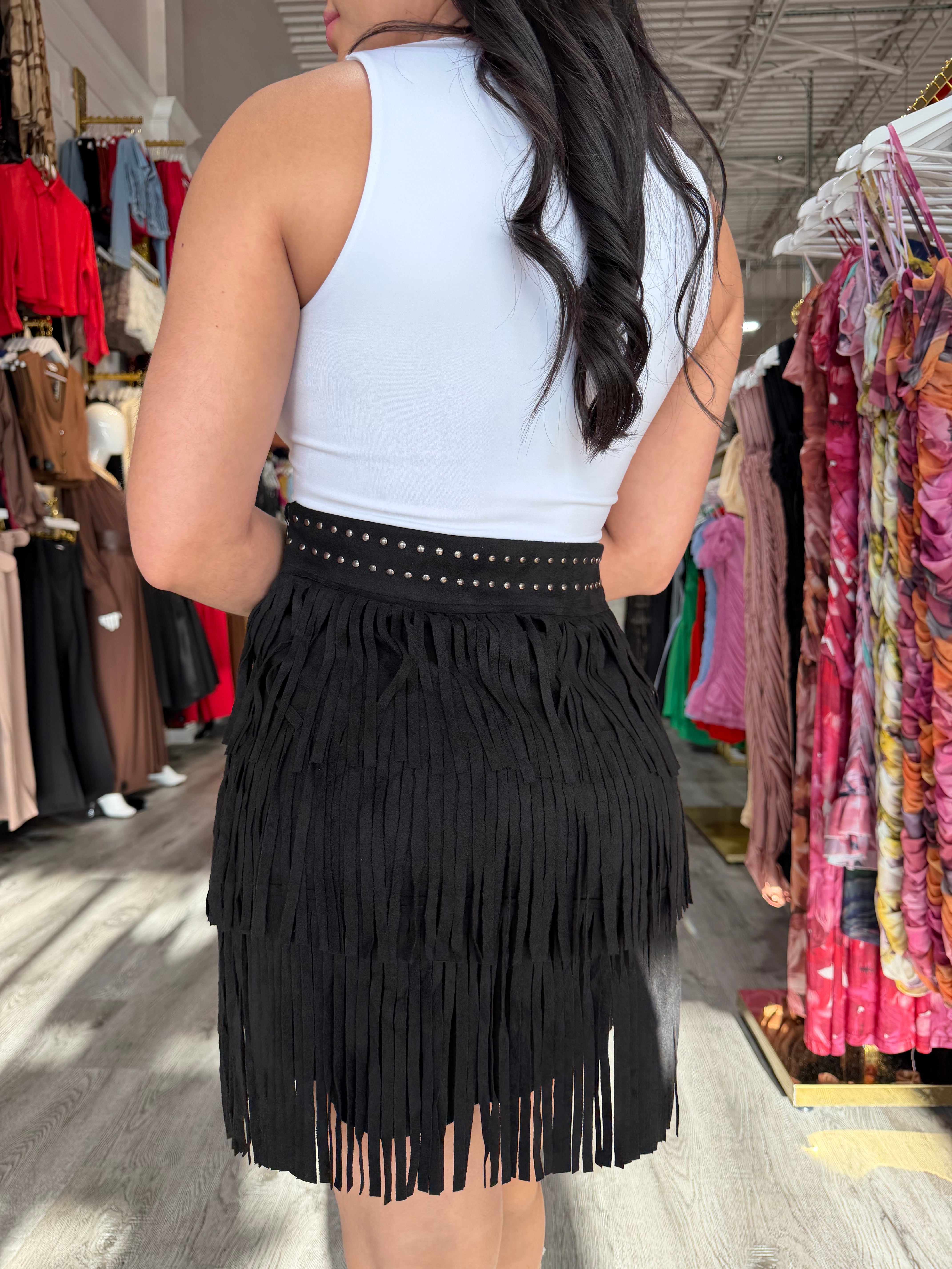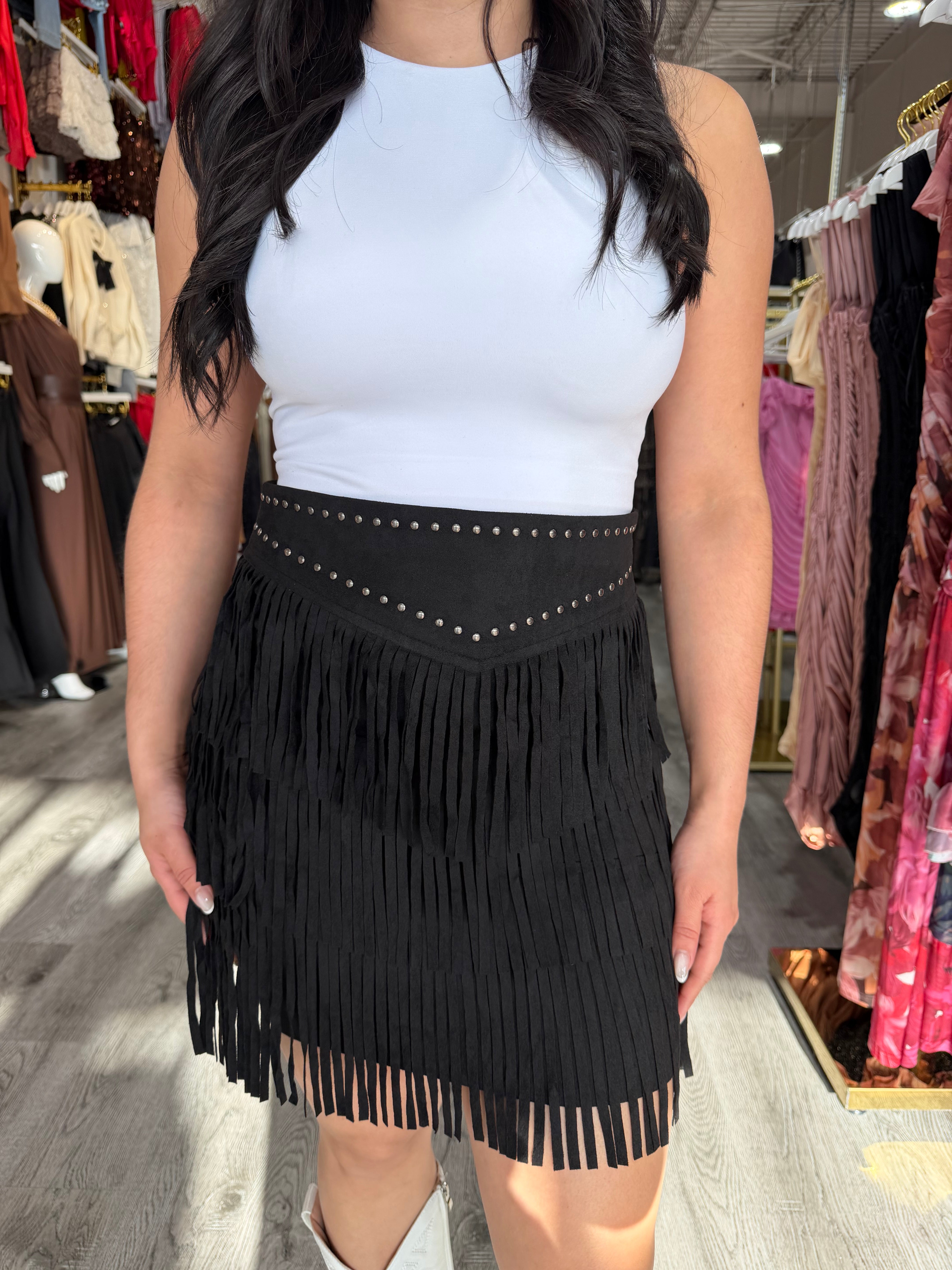 A striking western-inspired skirt featuring fringe detailing that cascades. Crafted from soft stretch velvet, this statement piece is designed with back darts at the waist for a flattering fit. The back zipper ensures a seamless finish, making it perfect for styling with boots, bodysuits, or chic western-inspired tops.