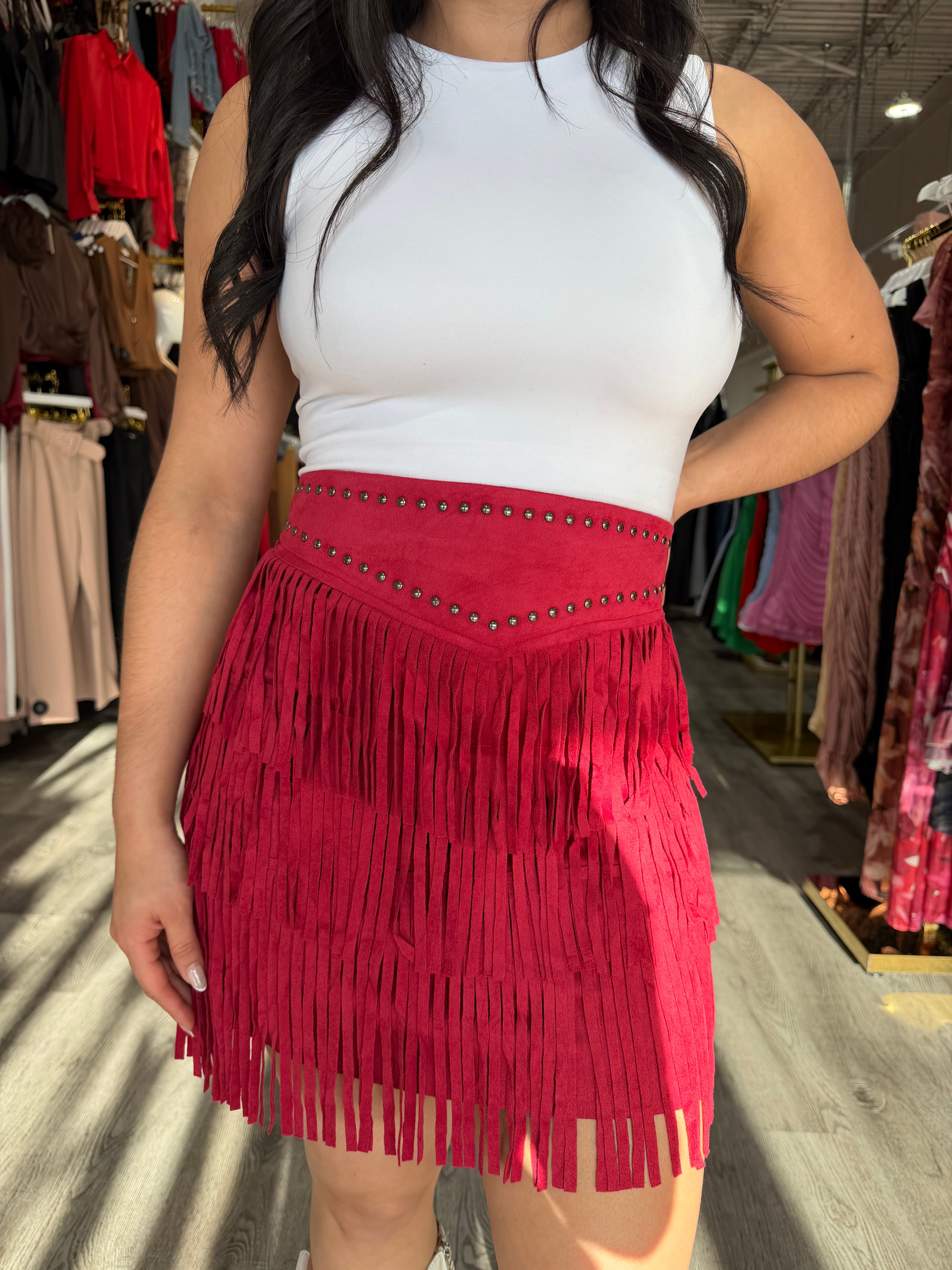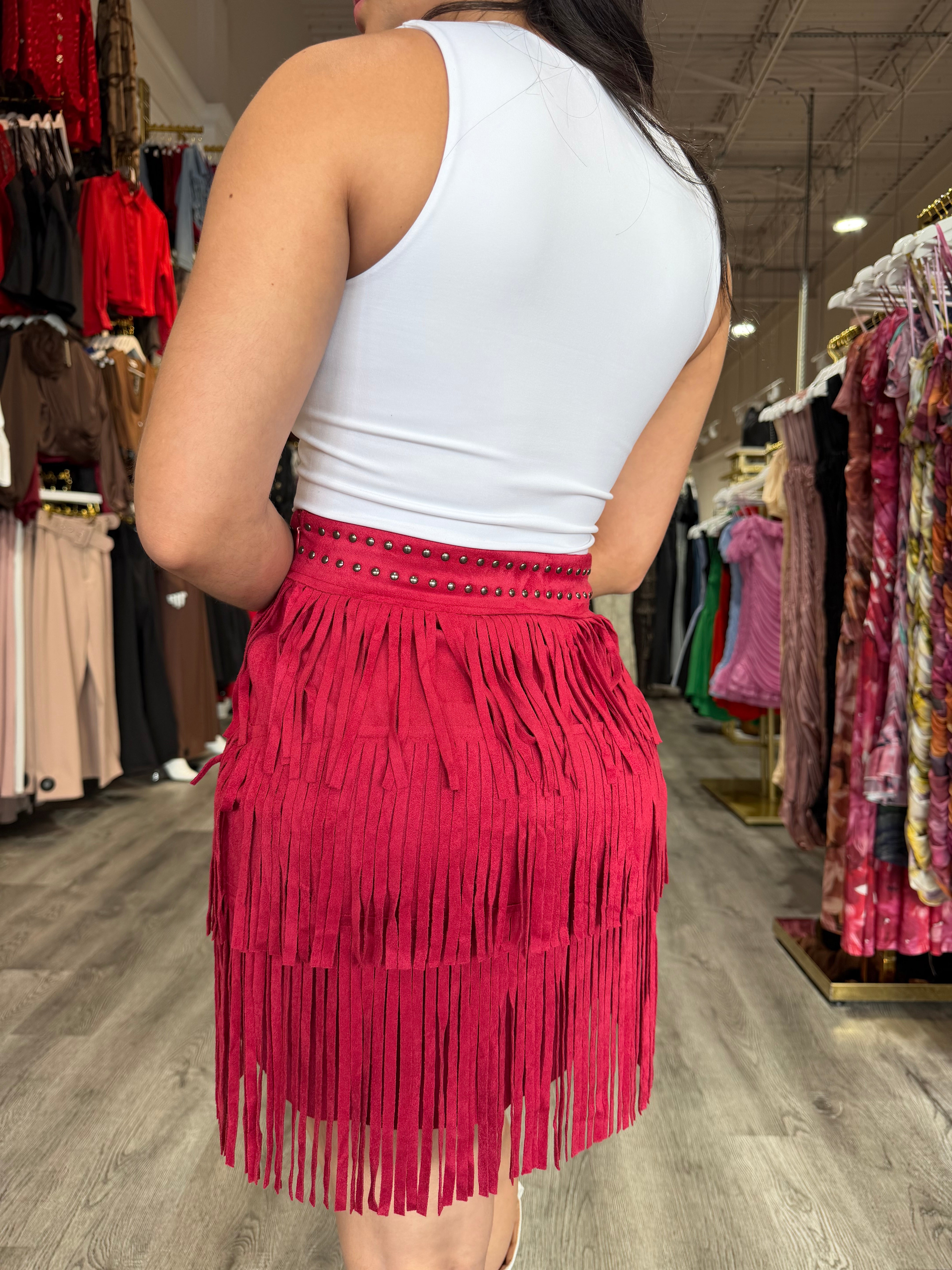 A striking western-inspired skirt featuring fringe detailing that cascades. Crafted from soft stretch velvet, this statement piece is designed with back darts at the waist for a flattering fit. The back zipper ensures a seamless finish, making it perfect for styling with boots, bodysuits, or chic western-inspired tops.